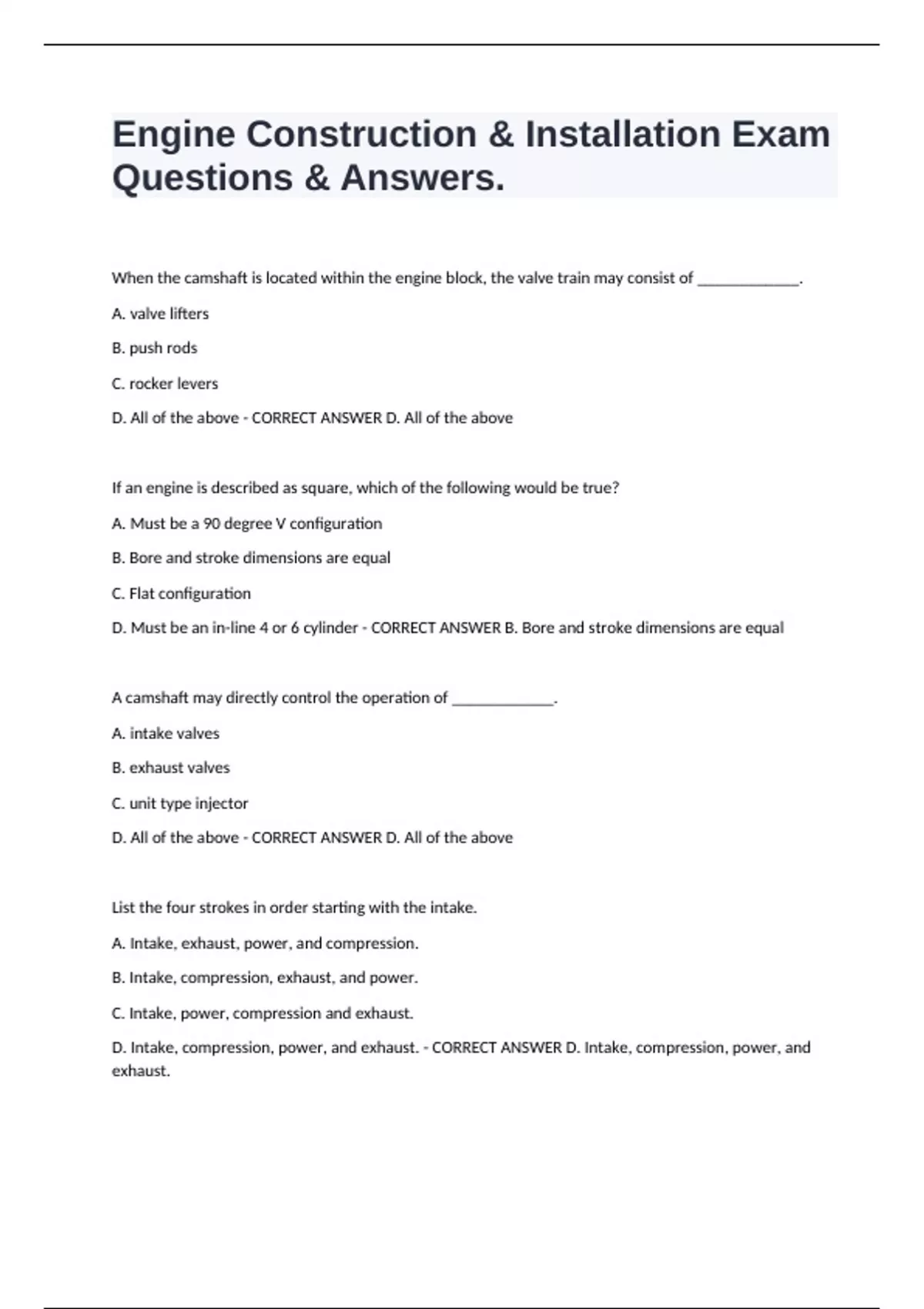 D. Must be an in-line 4 or 6 cylinder - CORRECT ANSWER B. Bore and stroke dimensions are equal