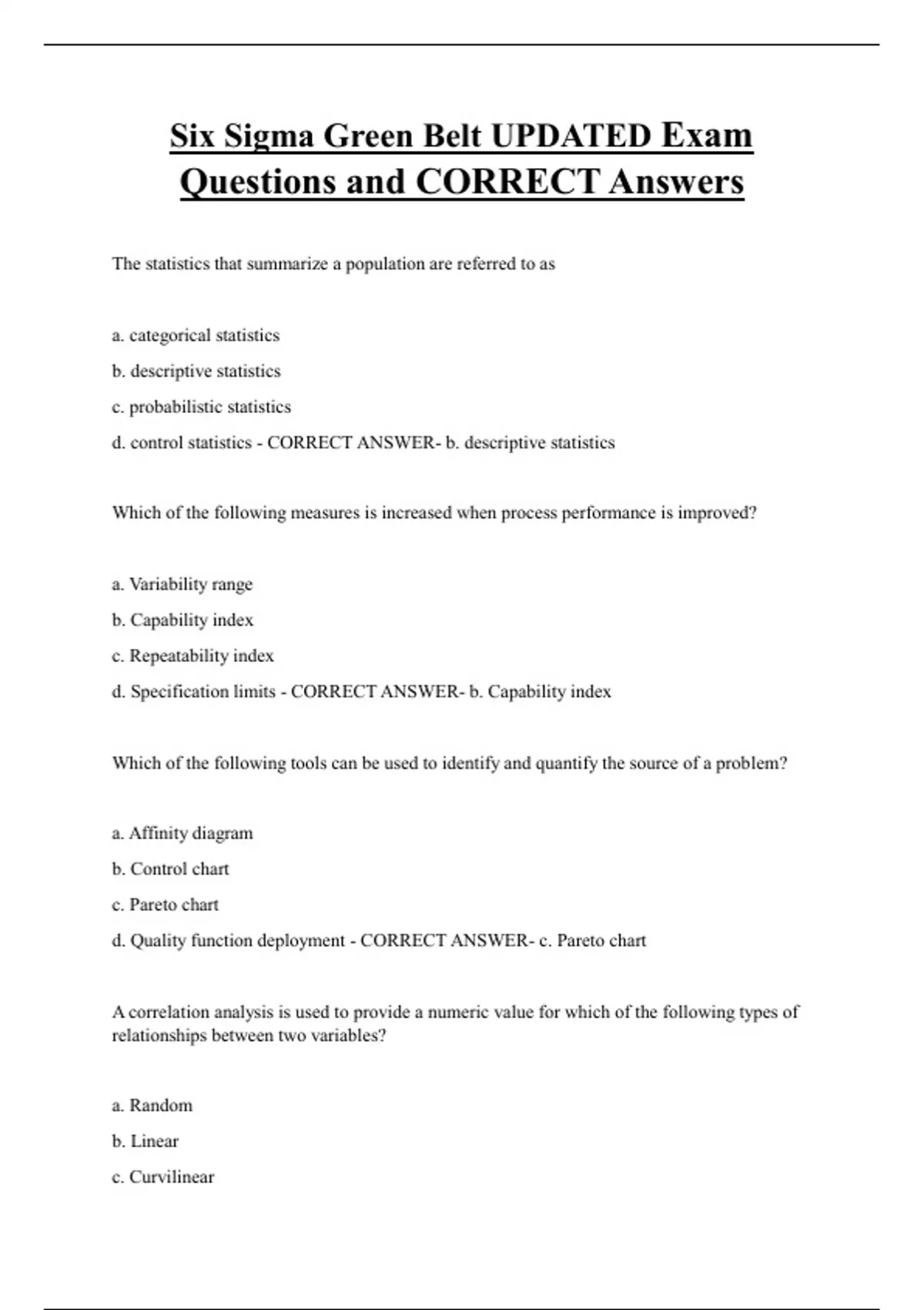 d. Quality function deployment - CORRECT ANSWER- c. Pareto chart