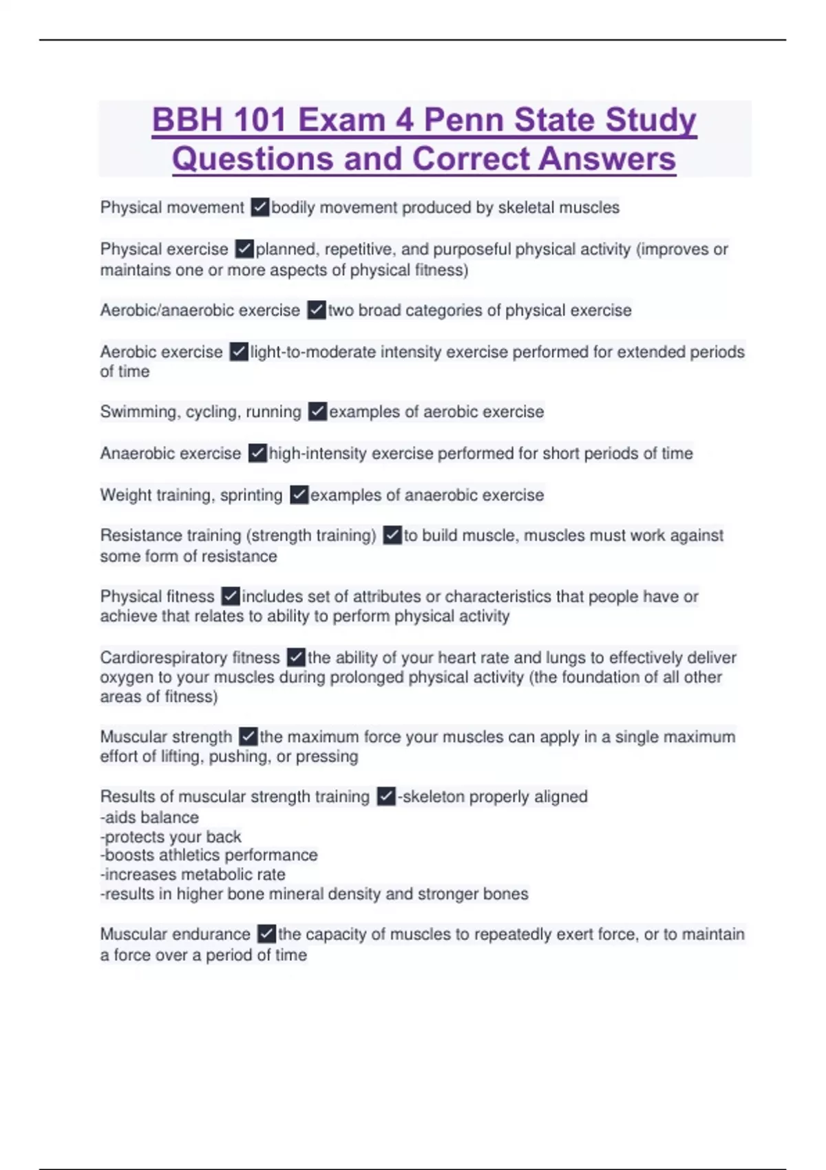 Physical movement bodily movement produced by skeletal muscles Physical exercise planned, repetitive, and purposeful physical activity (improves or maintains one or more aspects of physical fitness) Aerobic/anaerobic exercise two broad categories of physical exercise Aerobic exercise light-to-moderate intensity exercise performed for extended periods of time Swimming, cycling, running examples of aerobic exercise Anaerobic exercise high-intensity exercise performed for short periods of time Weight training, sprinting examples of anaerobic exercise Resistance training (strength training) to build muscle, muscles must work against some form of resistance Physical fitness includes set of attributes or characteristics that people have or achieve that relates to ability to perform physical activity Cardiorespiratory fitness the ability of your heart rate and lungs to effectively deliver oxygen to your muscles during prolonged physical activity (the foundation of all other areas of fitness) Muscular strength the maximum force your muscles can apply in a single maximum effort of lifting, pushing, or pressing Results of muscular strength training -skeleton properly aligned -aids balance -protects your back -boosts athletics performance -increases metabolic rate -results in higher bone mineral density and stronger bones Muscular endurance the capacity of muscles to repeatedly exert force, or to maintain a force over a period of time