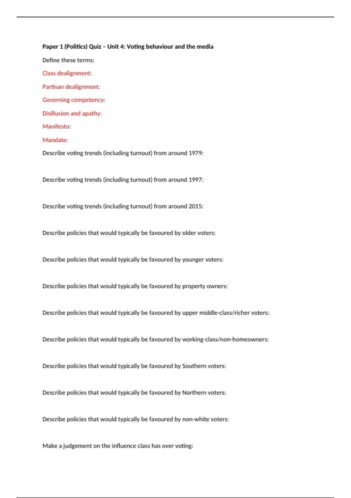 Paper 1 (Politics) Quiz – Unit 4: Voting behaviour and the media