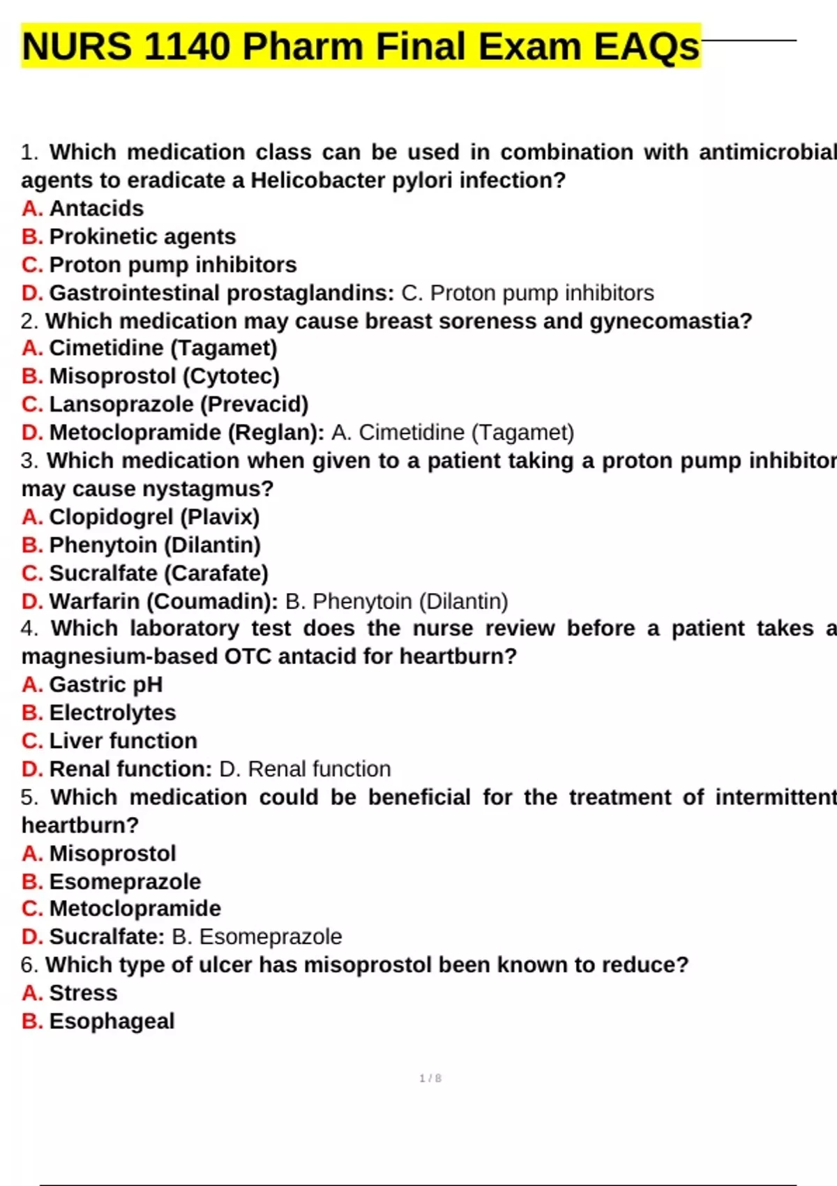 NURS 1140 Pharm Final Exam EAQs