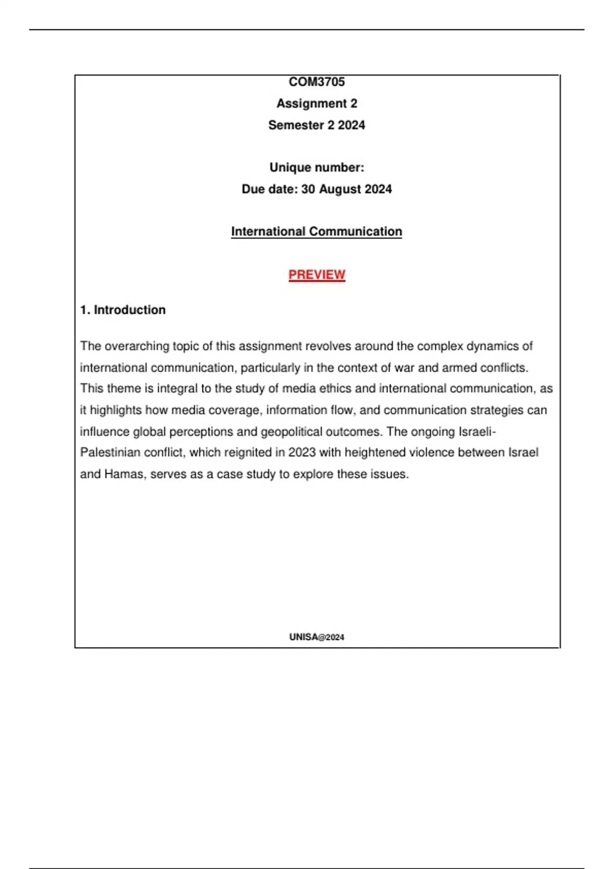 COM3705 Assignment 1 (COMPLETE QUESTIONS & ANSWERS) Semester 2 2024 - DUE 30 August 2024 ;100 % TRUSTED workings, Expert Solved, Explanations and Solutions. For assistance call or W.h.a.t.s.a.p.p us on ...(.+.2.5.4.7.7.9.5.4.0.1.3.2)........... 1. Introduction (5) In your introduction explain the overarching topic of the assignment and how it links to the module as a whole. Provide the background of the most recent Israeli-Palestinian (Hamas) (2023 - ) conflict. 2. Discuss the role of international communication in war and armed conflicts. (10) 3. Read Unit 4 and describe what you understand as the inequalities of international information (news) flow patterns and explain what causes these inequalities. (10) 4. Critically discuss the so-called CNN effect and whether it is still relevant today. (10) 5. Choose one of the following themes, read the relevant prescribed readings and critically discuss this theme in the context of the media coverage of the ongoing Israel-Palestine conflict. You need to discuss (and, if possible, attach) one example of media coverage related to your chosen theme. (50) a. Disinformation, misinformation, and social media Awuor Kokeyo, E. 2023. Exploring the dynamics of social media in shaping narratives and perceptions in the israeli-palestinian conflict: preliminary reflections, African Journal of Emerging Issues, 5(7):181-194. (13 Pages) Kertcher, C. & Turin, O. 2024. The Hyper Truth War: The Role of Atrocities from a Postdigital Perspective. Postdigital Science and Education, 6:400-408. (8 Pages) Lakhani, M & Khan, HMA. 2023. Fighting Disinformation in the Palestine Conflict: The Role of Generative AI and Islamic Values. Al-Misbah Research Journal, 3(4):2-13. (12 Pages) Oguojiofor, PO. 2024. The Role of Social Media in Shaping Narratives and Perceptions in the Israeli-Gaza Conflict that Escalated on October 2023. International Journal of Academic Multidisciplinary Research, 8(4):74-82. (10 Pages) Stănescu, G. 2023. Informational war: Analyzing false news in the Israel conflict. Social Sciences and Education Research Review, 10(2): 307-310. (4 Pages) Total Number of pages = 47 Pages b. Framing Irfan, I. 2024. Critical Discourse Analysis of Islamophobia Reflection in Gaza-Israel Conflict: A Case Study of BBC Reporting. Journal of Arts and Linguistics Studies, 2(1):289-301. (11 pages) Kirat, M. & Slamene, R. 2024. Covering Terrorism: How the News Media construct Reality. Kurdish Studies, 12(2):. (11 Pages) Livio, O & Cohen-Yechezkely, S. 2019. Copy, Edit, Paste. Journalism Studies, 20(5):696-713, DOI: 10.1080/1461670X.2017.1417054 (16 Pages) Zawawi, M., Raswari Jambak, M., Hasanah, U., Basid, A. & Anas, K. 2024. Framing of Hamas Attacks on Israel in Al-Jazeera and BBC Coverage. Eralingua, 8(1):81-94. (14 Pages) Total Number of pages = 52 Pages c. Citizen journalism and user-generated content Alakklouk, B & Gülnar, B. 2023. The Impact of Citizen Journalism in News Coverage of the Israeli Attacks on Gaza. South Asian Journal of Social Sciences & Humanities, 4(4):76-100. (25 Pages) Chouliaraki, L. & Al-Ghazzi, O. Citizen media as flesh witnessing: Embodied testimonies of war in Western news journalism, in Postcolonial publics: Art and citizen media in Europe, edited by B. Blaagaard, S. Marchetti, S. Ponzanesi & S. Bassi. Venice: Venice University Press. (320 Pages) Horoub, I. 2024. Exploring the Nexus of Citizen Journalism, Technology, and Psychology: Insights from Palestinian Journalists, Journalism Practice, DOI: 10.1080/.2023.2288588 (26 Pages) Total Number of pages = 371 Pages 6. Conclusion (5) Write the conclusion of your assignment that summarises the key points and key findings