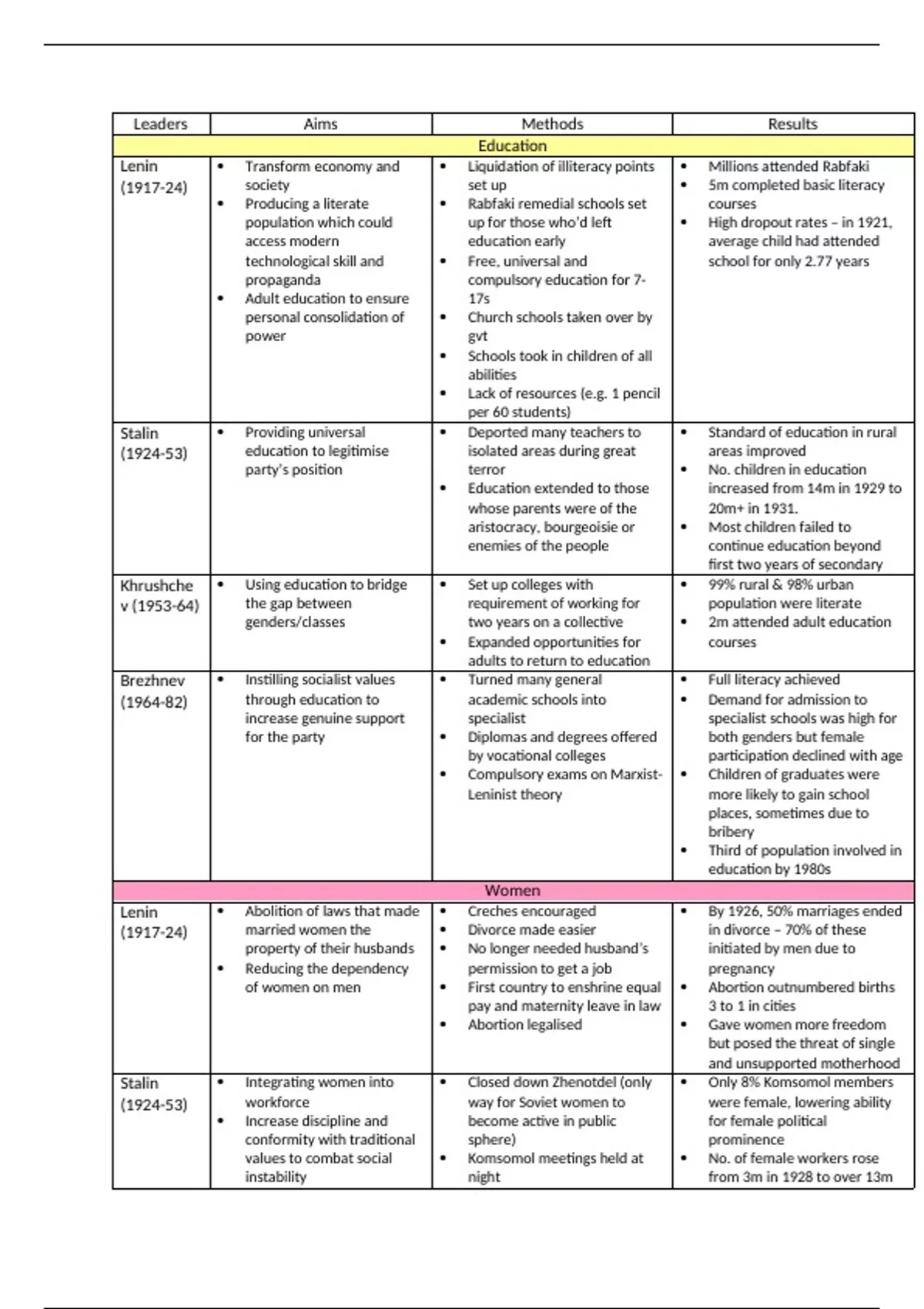 All the key information about the USSR you need to know for your Pearson Edexcel A-Level History exams! Aims, methods and results for all three leaders for: education, women, social security policies, terror, industry, agriculture, secret police, art and culture, cults of personality, centralisation (none for K/B), party membership/Nomenklatura, religion, and media & propaganda. 11 pages, 4100+ words Helped me get an A* in A-Level History!