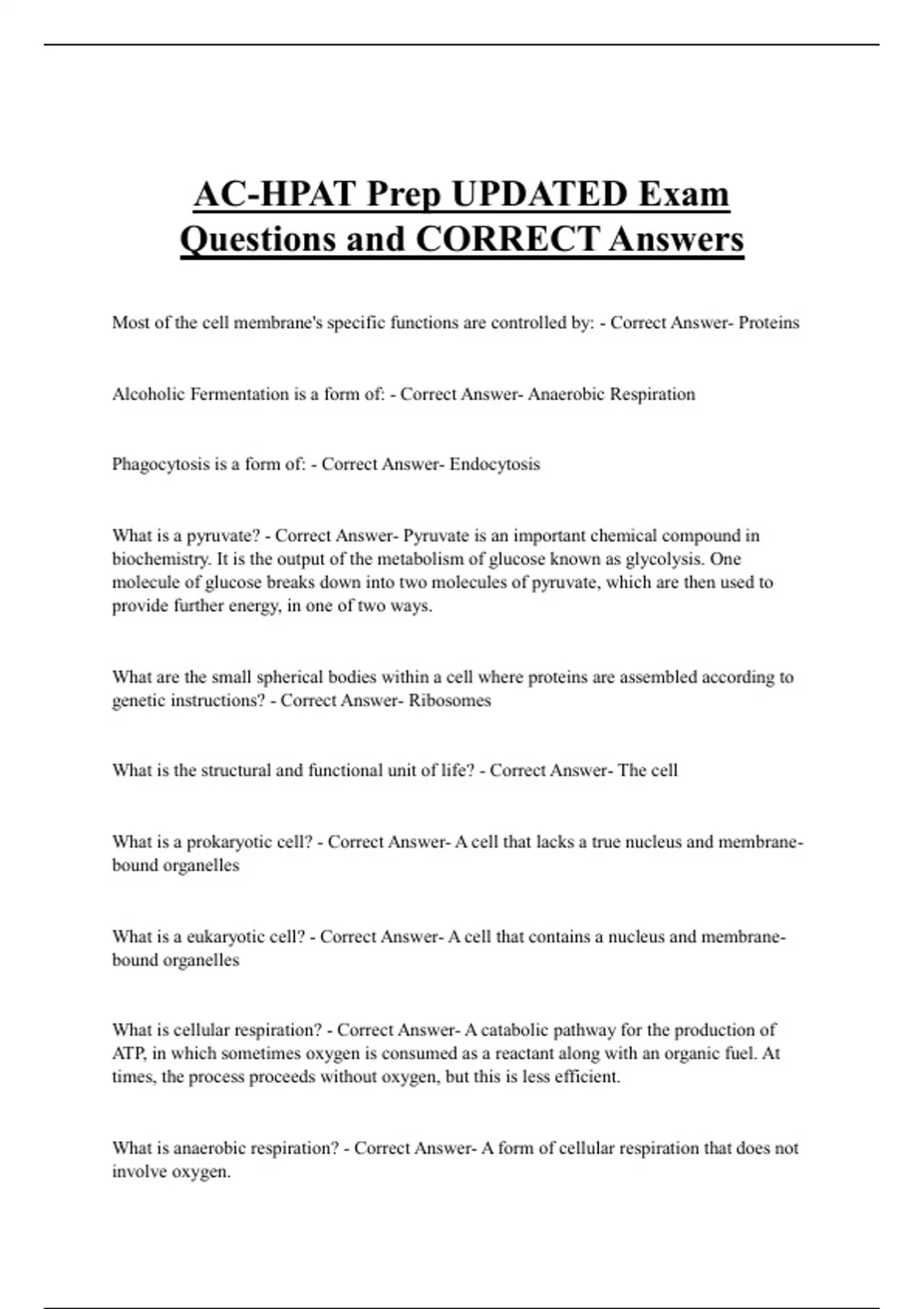 AC-HPAT Prep UPDATED Exam Questions and CORRECT Answers Most of the cell membrane's specific functions are controlled by: - Correct Answer- Proteins Alcoholic Fermentation is a form of: - Correct Answer- Anaerobic Respiration Phagocytosis is a form of: - Correct Answer- Endocytosis