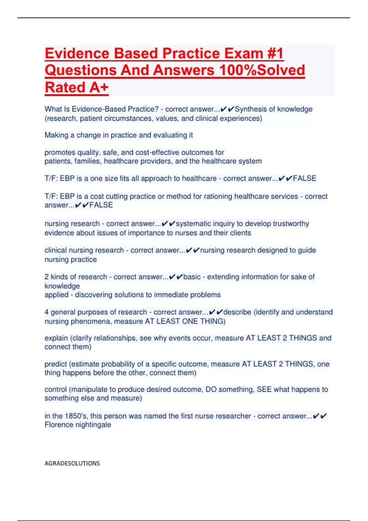 Evidence Based Practice Exam #1 Questions And Answers 100%Solved Rated A+ What Is Evidence-Based Practice? - correct answer...Synthesis of knowledge (research, patient circumstances, values, and clinical experiences) Making a change in practice and evaluating it promotes quality, safe, and cost-effective outcomes for patients, families, healthcare providers, and the healthcare system T/F: EBP is a one size fits all approach to healthcare - correct answer...FALSE T/F: EBP is a cost cutting practice or method for rationing healthcare services - correct answer...FALSE nursing research - correct answer...systematic inquiry to develop trustworthy evidence about issues of importance to nurses and their clients clinical nursing research - correct answer...nursing research designed to guide nursing practice 2 kinds of research - correct answer...basic - extending information for sake of knowledge applied - discovering solutions to immediate problems 4 general purposes of research - correct answer...describe (identify and understand nursing phenomena, measure AT LEAST ONE THING) explain (clarify relationships, see why events occur, measure AT LEAST 2 THINGS and connect them) predict (estimate probability of a specific outcome, measure AT LEAST 2 THINGS, one thing happens before the other, connect them) control (manipulate to produce desired outcome, DO something, SEE what happens to something else and measure) in the 1850's, this person was named the first nurse researcher - correct answer...Florence nightingale What is Florence nightingale's research work? - correct answer...initial studies focused on the importance of a healthy environment in promoting patients' physical and mental well-being. studied ventilation, cleanliness, purity of water, and diet to determine their influence on patients' health also noted for her data collection and analyses (mortality rates), especially during the Crimean War. changed the attitudes of the military and society about the care of the sick. Because of Nightingale's research evidence and influence, society began to accept responsibility for testing public water, improving sanitation, preventing starvation, and decreasing morbidity and mortality rates Identifying and understanding the nature of nursing phenomena and the relationships among the phenomena are examples of __________? a. Description b. Explanation c. Prediction d. Control - correct answer...Description and Explanation T/F Quantitative research involves identification - correct answer...False T/F Quantitative research involves prediction & control - correct answer...True T/F both quantitative and qualitative data involve description, exploration and explanation - correct answer...True focuses on examining results of care and determining the changes in health status for the patient - correct answer...outcomes research a researcher who does not disclose that a portion of the data from the original study sample was not used in the final data analysis could be accused of: A. Infidelity B. Lack of scientific objectivity C. Plagiarism D. Scientific misconduct - correct answer...Scientific misconduct; includes fabrication, falsification or forging therapeutic versus non therapeutic research - correct answer...therapeutic: results might benefit participants non-therapeutic: results don't benefit participants but might in the future What ar 3 ethical principles addressed in the National Commission for the Protection of Human Subjects guidelines - correct answer...respect for persons (no coercion), beneficence (do no harm), justice (fair treatment) what principle describes this: individuals should be treated as autonomous agents persons with diminished autonomy are entitled to protection - correct answer...respect for person what principle describes this: max possible benefits and minimize possible harms - correct answer...beneficence what principle describes this: fairness in distribution or what is deserved - correct answer...justice what are the principles of respect for persons - correct answer...self-determination no coercion full disclosure, no deception voluntary consent special protection for those with diminished autonomy what are the principles of beneficence - correct answer...freedom from harm freedom from exploitation risk/benefit rations high anticipated benefits may balance high risks what are the principles of justice - correct answer...Fair treatment (even if the person chooses not to participate) Right to privacy Anonymity Confidentiality what are the 5 human rights that require protection in research? - correct answer...right to self determination (freedom to conduct their lives as they chose) right to privacy (freedom to determine the time, extent, and general circumstance where private info will be shared) right to anonymity and confidentiality (no one knows the identity of the subjects; refrains from sharing info with others) right to fair treatment (based