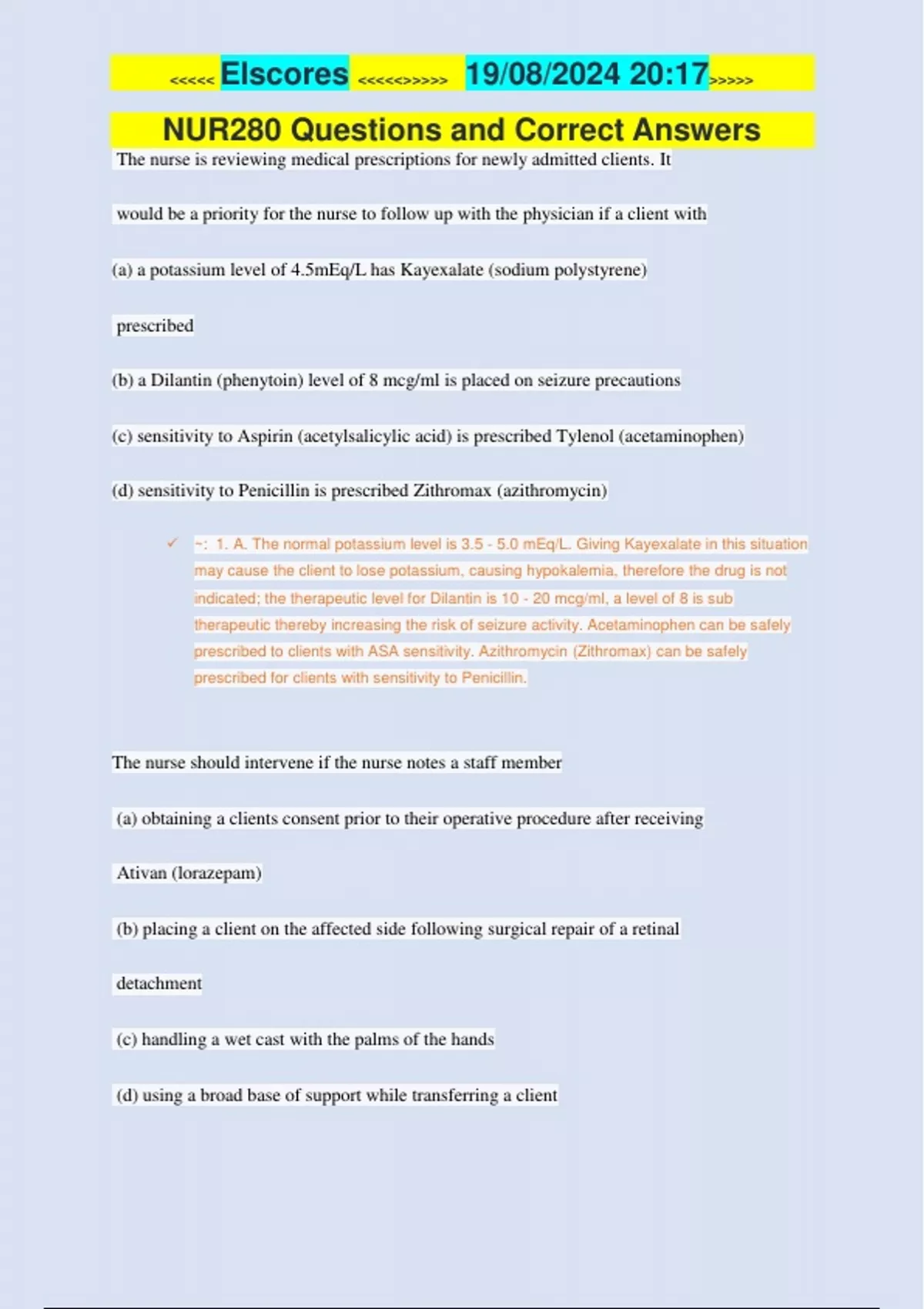 ✓ ~: 1. A. The normal potassium level is 3.5 - 5.0 mEq/L. Giving Kayexalate in this situation