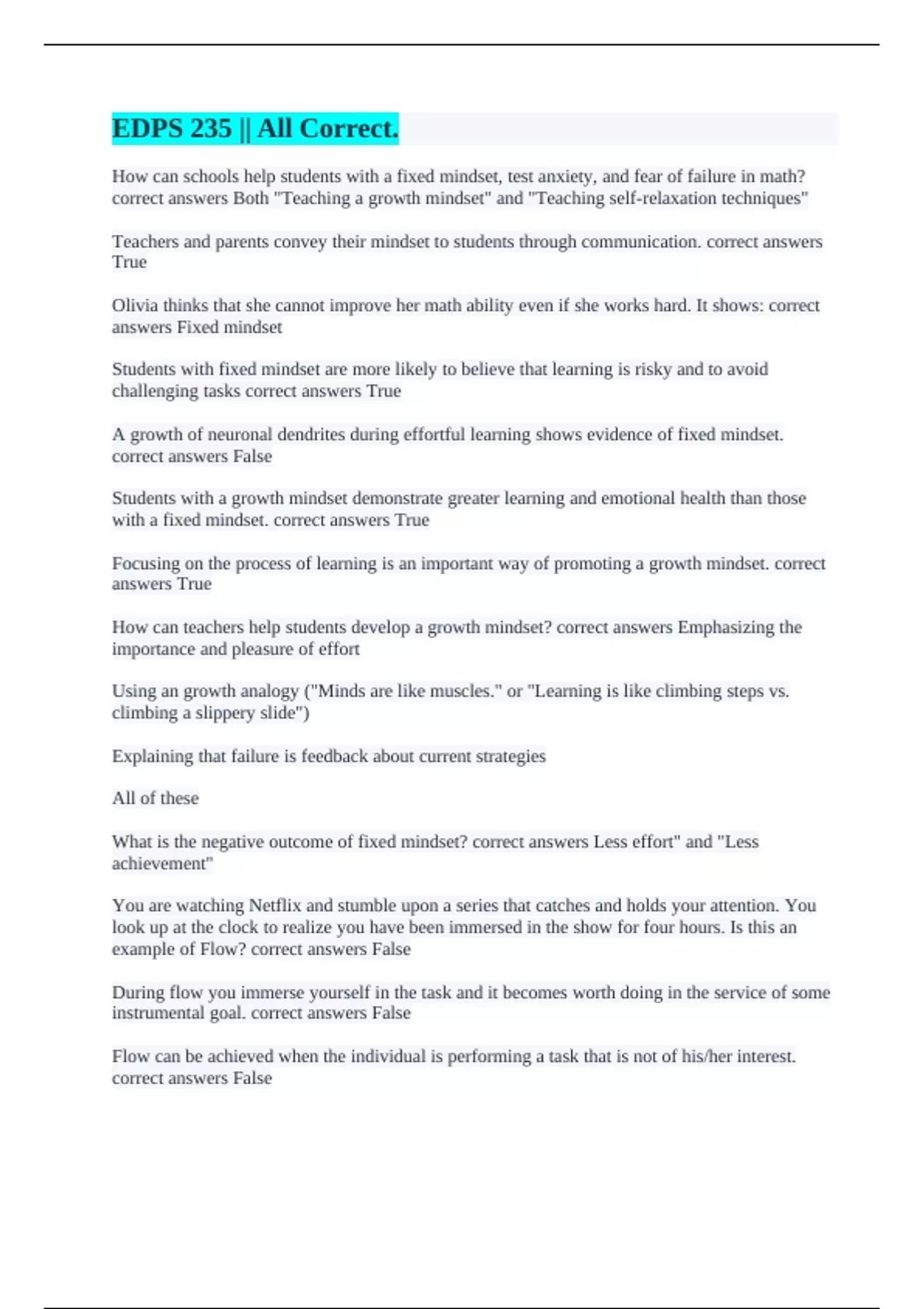 answers Fixed mindset
