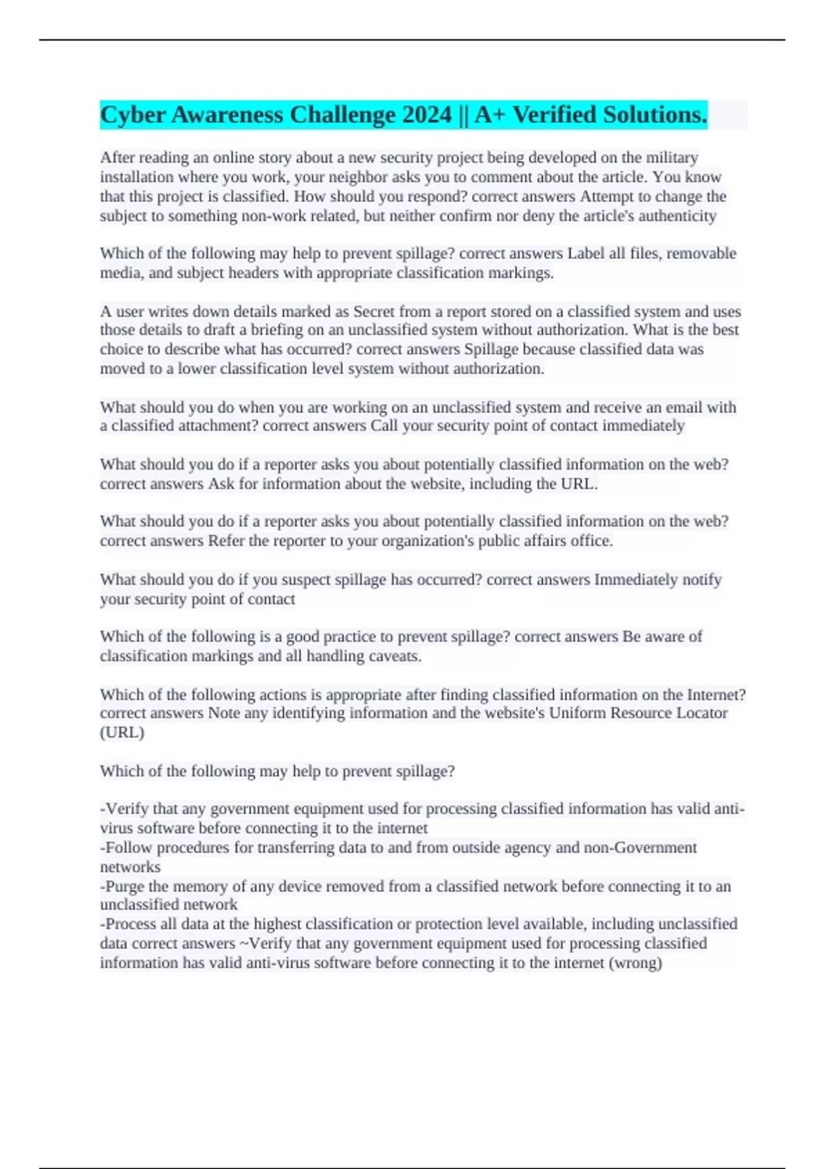 After reading an online story about a new security project being developed on the military installation where you work, your neighbor asks you to comment about the article. You know that this project is classified. How should you respond? correct answers Attempt to change the subject to something non-work related, but neither confirm nor deny the article's authenticity Which of the following may help to prevent spillage? correct answers Label all files, removable media, and subject headers with appropriate classification markings. A user writes down details marked as Secret from a report stored on a classified system and uses those details to draft a briefing on an unclassified system without authorization. What is the best choice to describe what has occurred? correct answers Spillage because classified data was moved to a lower classification level system without authorization. What should you do when you are working on an unclassified system and receive an email with a classified attachment? correct answers Call your security point of contact immediately What should you do if a reporter asks you about potentially classified information on the web? correct answers Ask for information about the website, including the URL. What should you do if a reporter asks you about potentially classified information on the web? correct answers Refer the reporter to your organization's public affairs office. What should you do if you suspect spillage has occurred? correct answers Immediately notify your security point of contact Which of the following is a good practice to prevent spillage? correct answers Be aware of classification markings and all handling caveats. Which of the following actions is appropriate after finding classified information on the Internet? correct answers Note any identifying information and the website's Uniform Resource Locator (URL) Which of the following may help to prevent spillage? -Verify that any government equipment used for processing classified information has valid anti-virus software before connecting it to the internet -Follow procedures for transferring data to and from outside agency and non-Government networks -Purge the memory of any device removed from a classified network before connecting it to an unclassified network -Process all data at the highest classification or protection level available, including unclassified data correct answers ~Verify that any government equipment used for processing classified information has valid anti-virus software before connecting it to the internet (wrong)
