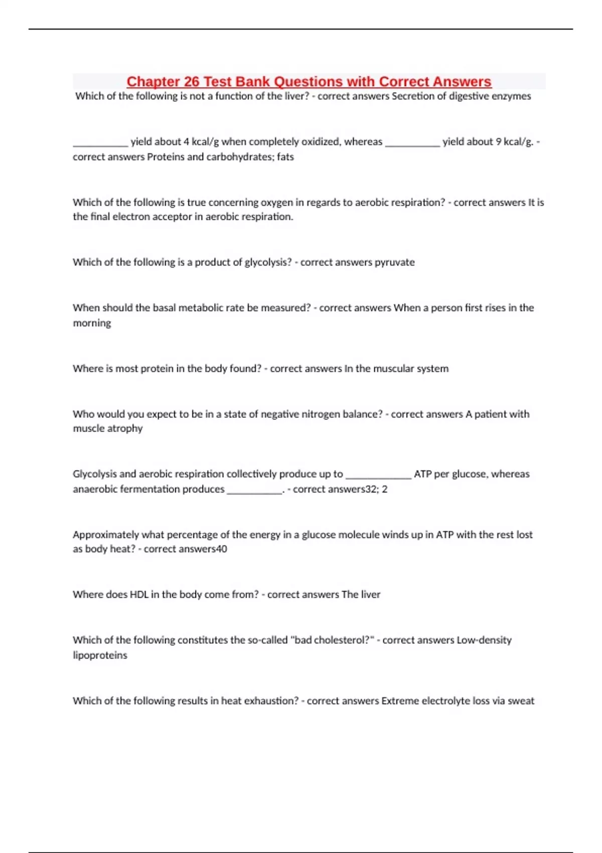 Chapter 26 Test Bank Questions with Correct Answers Which of the following is not a function of the liver? - correct answers Secretion of digestive enzymes __________ yield about 4 kcal/g when completely oxidized, whereas __________ yield about 9 kcal/g. - correct answers Proteins and carbohydrates; fats Which of the following is true concerning oxygen in regards to aerobic respiration? - correct answers It is the final electron acceptor in aerobic respiration. Which of the following is a product of glycolysis? - correct answers pyruvate When should the basal metabolic rate be measured? - correct answers When a person first rises in the morning Where is most protein in the body found? - correct answers In the muscular system Who would you expect to be in a state of negative nitrogen balance? - correct answers A patient with muscle atrophy Glycolysis and aerobic respiration collectively produce up to ____________ ATP per glucose, whereas anaerobic fermentation produces __________. - correct answers32; 2 Approximately what percentage of the energy in a glucose molecule winds up in ATP with the rest lost as body heat? - correct answers40 Where does HDL in the body come from? - correct answers The liver Which of the following constitutes the so-called "bad cholesterol?" - correct answers Low-density lipoproteins Which of the following results in heat exhaustion? - correct answers Extreme electrolyte loss via sweat