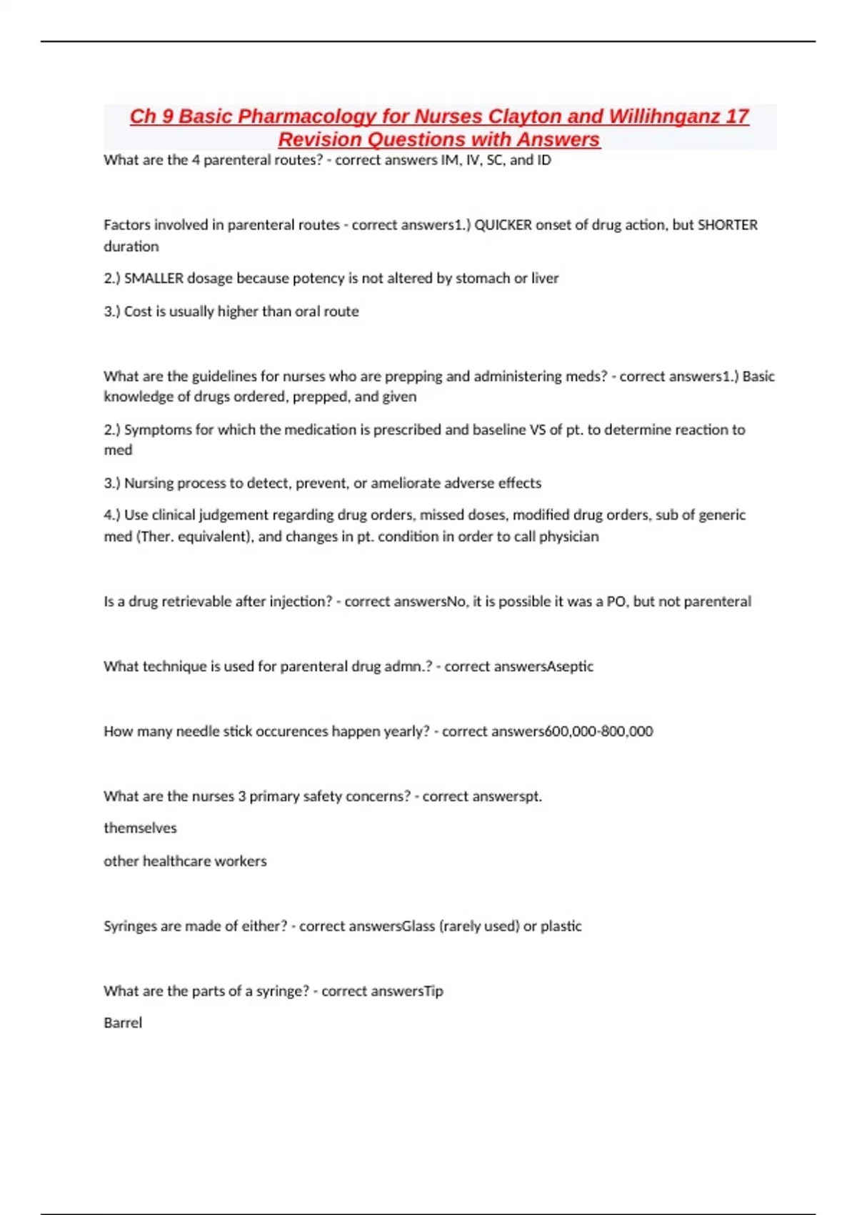 Ch 9 Basic Pharmacology for Nurses Clayton and Willihnganz 17 Revision Questions with Answers What are the 4 parenteral routes? - correct answers IM, IV, SC, and ID Factors involved in parenteral routes - correct answers1.) QUICKER onset of drug action, but SHORTER duration 2.) SMALLER dosage because potency is not altered by stomach or liver 3.) Cost is usually higher than oral route What are the guidelines for nurses who are prepping and administering meds? - correct answers1.) Basic knowledge of drugs ordered, prepped, and given 2.) Symptoms for which the medication is prescribed and baseline VS of pt. to determine reaction to med 3.) Nursing process to detect, prevent, or ameliorate adverse effects 4.) Use clinical judgement regarding drug orders, missed doses, modified drug orders, sub of generic med (Ther. equivalent), and changes in pt. condition in order to call physician Is a drug retrievable after injection? - correct answersNo, it is possible it was a PO, but not parenteral What technique is used for parenteral drug admn.? - correct answersAseptic How many needle stick occurences happen yearly? - correct answers600,000-800,000 What are the nurses 3 primary safety concerns? - correct answerspt. themselves other healthcare workers Syringes are made of either? - correct answersGlass (rarely used) or plastic What are the parts of a syringe? - correct answersTip Barrel