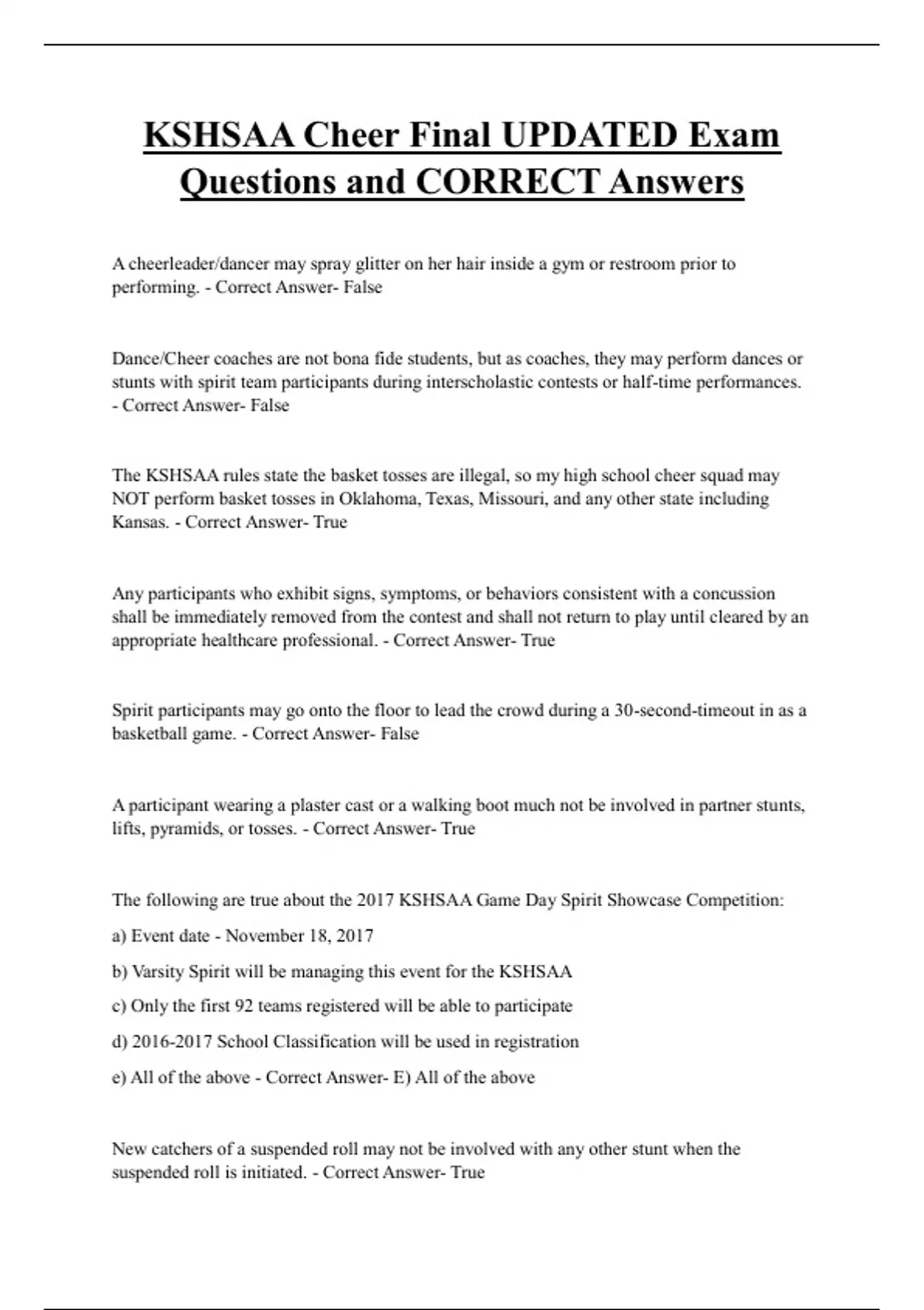 KSHSAA Cheer Final UPDATED Exam Questions and CORRECT Answers A cheerleader/dancer may spray glitter on her hair inside a gym or restroom prior to performing. - Correct Answer- False Dance/Cheer coaches are not bona fide students, but as coaches, they may perform dances or stunts with spirit team participants during interscholastic contests or half-time performances. - Correct Answer- False