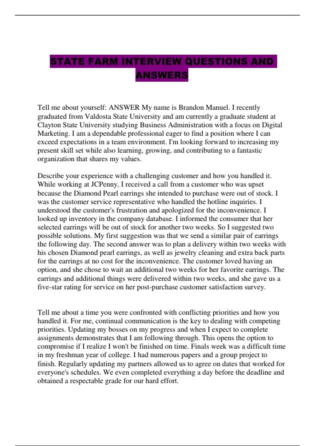 STATE FARM INTERVIEW QUESTIONS AND ANSWERS