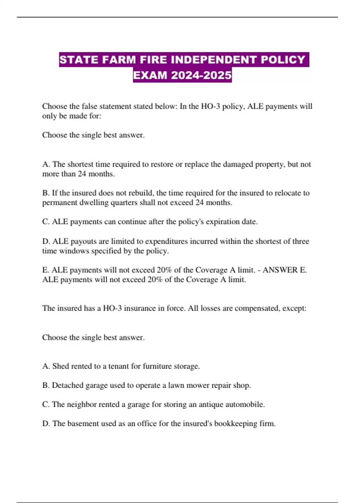 E. ALE payments will not exceed 20% of the Coverage A limit. - ANSWER E.