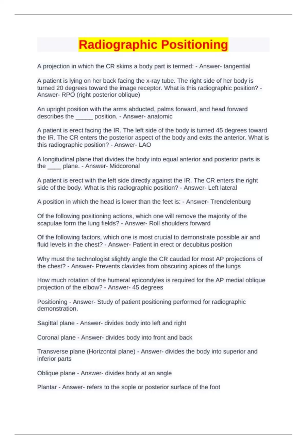 Radiographic Positioning Questions with Correct Answers