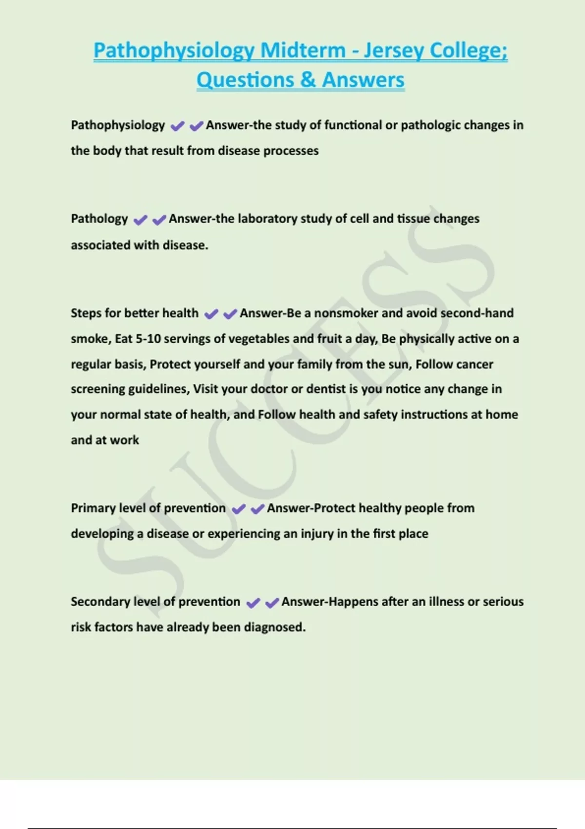 Pathophysiology Midterm - Jersey College; Questions & Answers Pathophysiology Answer-the study of functional or pathologic changes in the body that result from disease processes Pathology Answer-the laboratory study of cell and tissue changes associated with disease. Steps for better health Answer-Be a nonsmoker and avoid second-hand smoke, Eat 5-10 servings of vegetables and fruit a day, Be physically active on a regular basis, Protect yourself and your family from the sun, Follow cancer screening guidelines, Visit your doctor or dentist is you notice any change in your normal state of health, and Follow health and safety instructions at home
