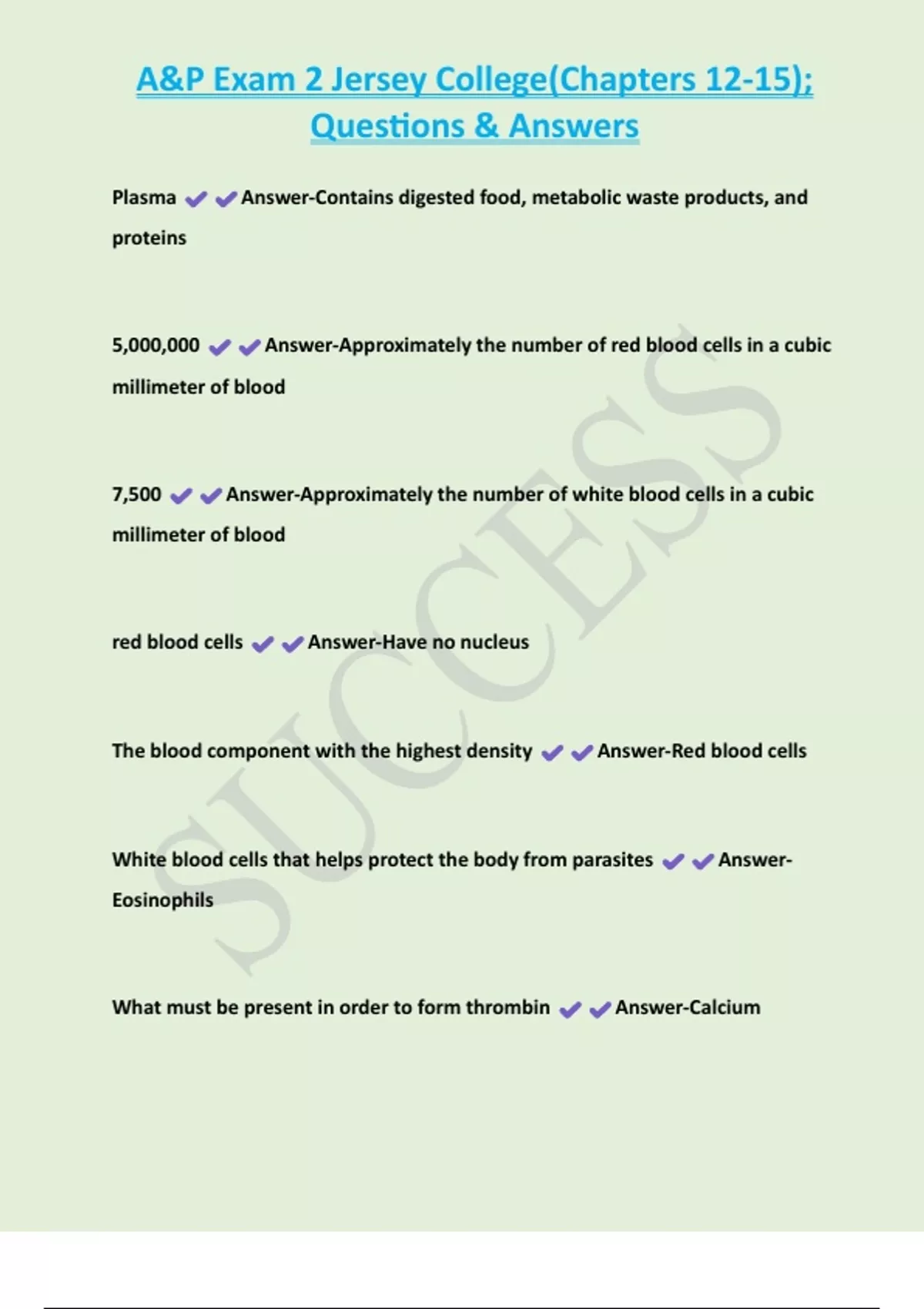 A&P Exam 2 Jersey College(Chapters 12-15); Questions & Answers Plasma Answer-Contains digested food, metabolic waste products, and proteins 5,000,000 Answer-Approximately the number of red blood cells in a cubic millimeter of blood 7,500 Answer-Approximately the number of white blood cells in a cubic millimeter of blood