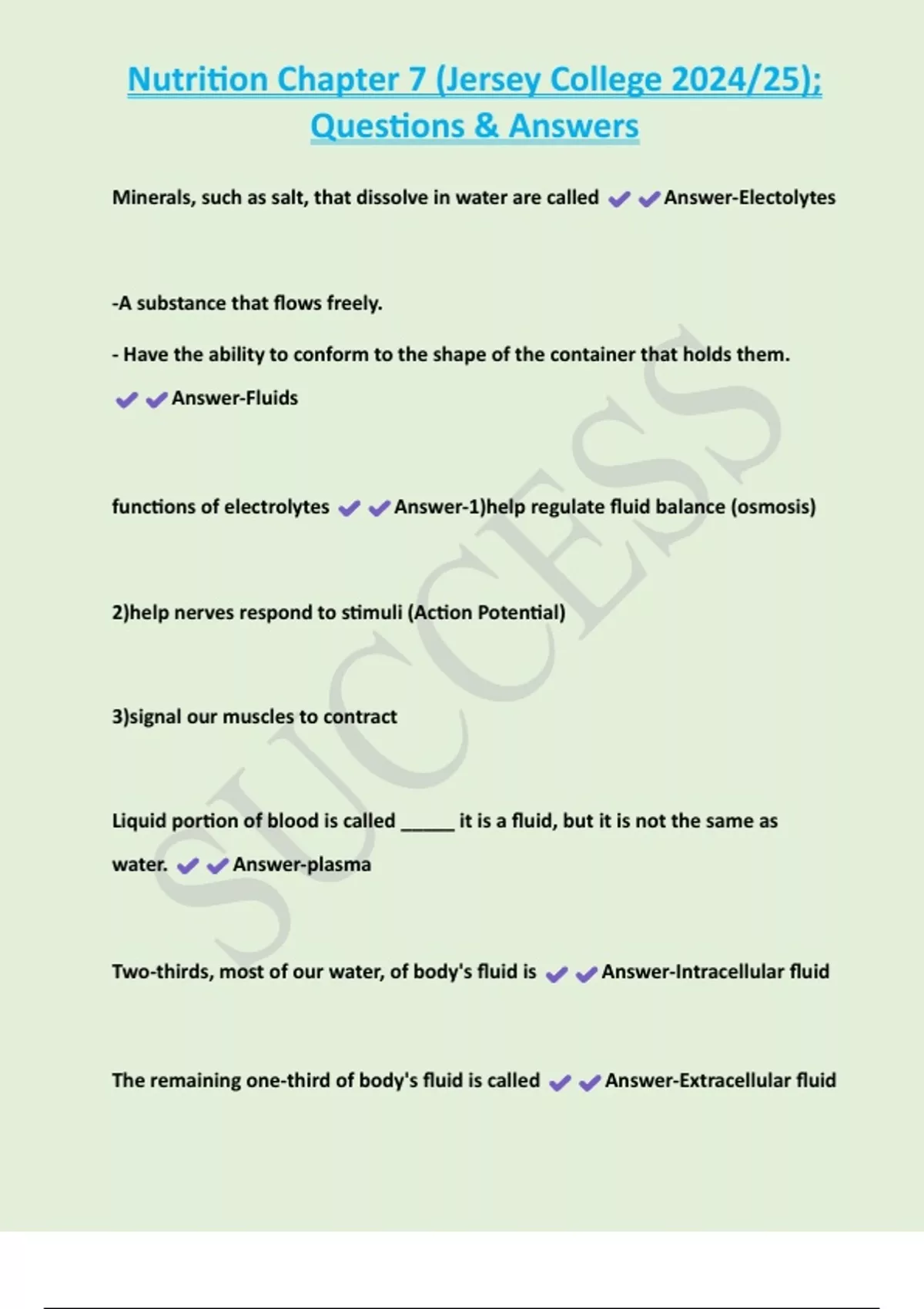 functions of electrolytes Answer-1)help regulate fluid balance (osmosis)
