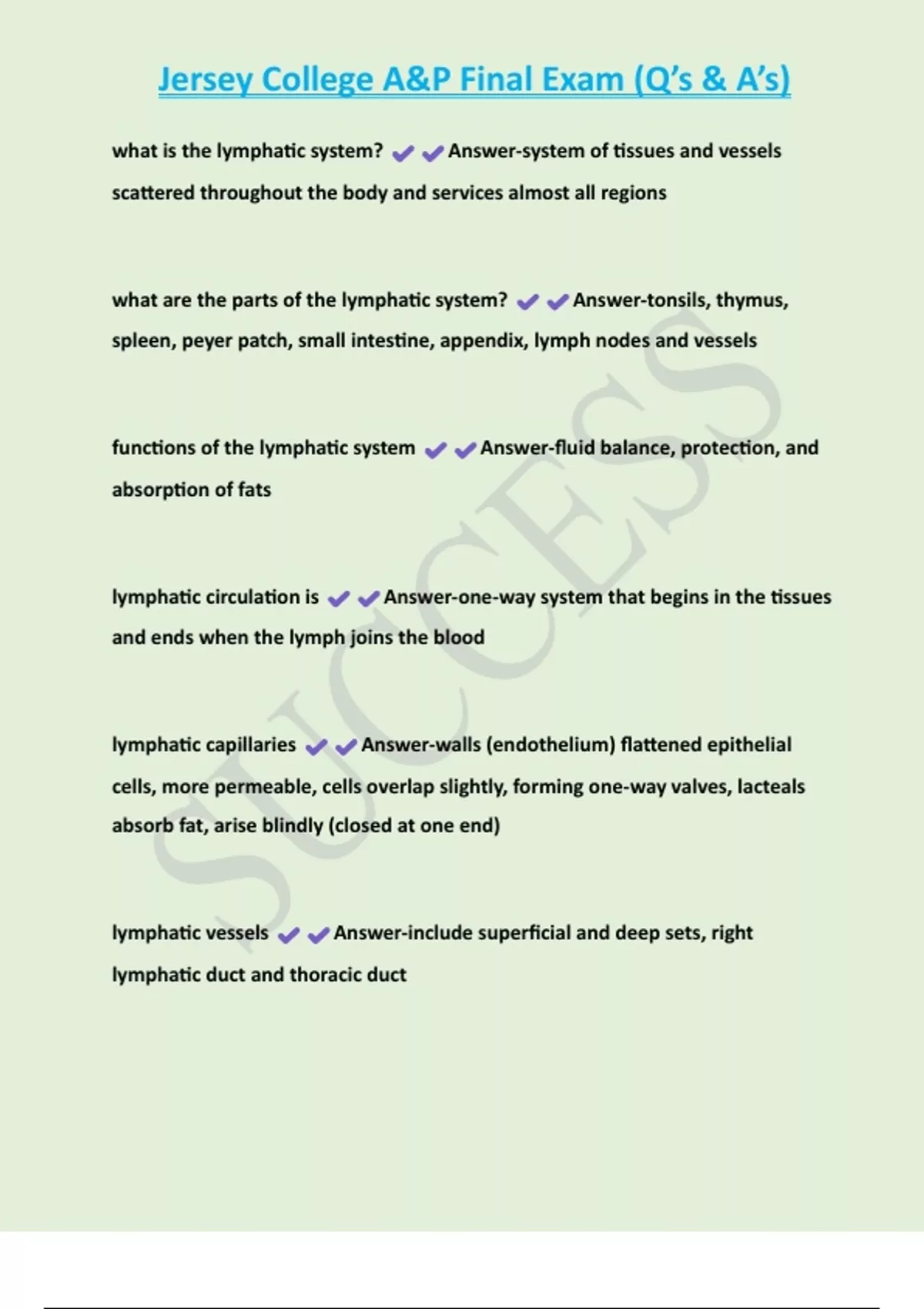 Jersey College A&P Final Exam (Q’s & A’s) what is the lymphatic system? Answer-system of tissues and vessels scattered throughout the body and services almost all regions what are the parts of the lymphatic system? Answer-tonsils, thymus, spleen, peyer patch, small intestine, appendix, lymph nodes and vessels functions of the lymphatic system Answer-fluid balance, protection, and absorption of fats