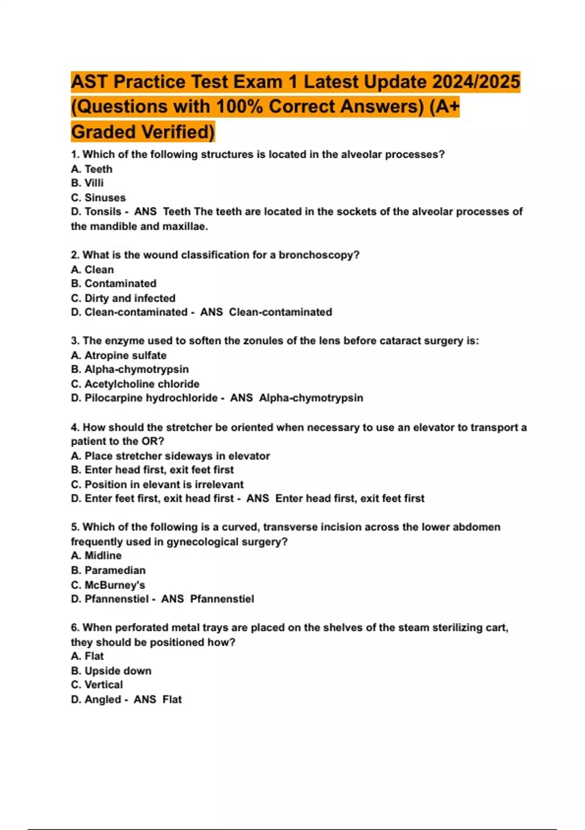 1. Which of the following structures is located in the alveolar processes? A. Teeth B. Villi C. Sinuses D. Tonsils - ANS Teeth The teeth are located in the sockets of the alveolar processes of the mandible and maxillae. 2. What is the wound classification for a bronchoscopy? A. Clean B. Contaminated C. Dirty and infected D. Clean-contaminated - ANS Clean-contaminated 3. The enzyme used to soften the zonules of the lens before cataract surgery is: A. Atropine sulfate B. Alpha-chymotrypsin C. Acetylcholine chloride D. Pilocarpine hydrochloride - ANS Alpha-chymotrypsin