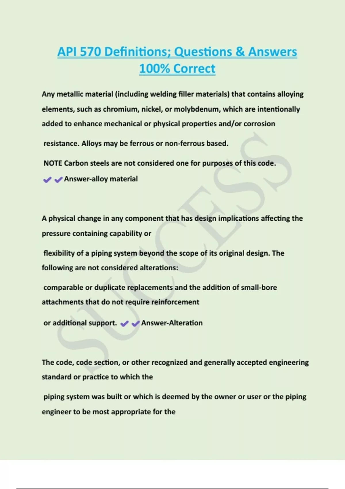 API 570 Definitions; Questions & Answers 100% Correct Any metallic material (including welding filler materials) that contains alloying elements, such as chromium, nickel, or molybdenum, which are intentionally added to enhance mechanical or physical properties and/or corrosion resistance. Alloys may be ferrous or non-ferrous based. NOTE Carbon steels are not considered one for purposes of this code. Answer-alloy materia