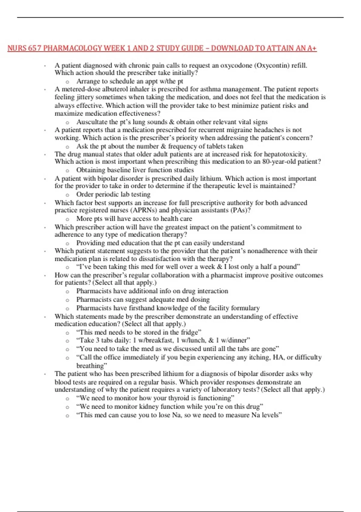 NURS 657 PHARMACOLOGY WEEK 1 AND 2 STUDY GUIDE – DOWNLOAD TO ATTAIN AN A+ • A patient diagnosed with chronic pain calls to request an oxycodone (Oxycontin) refill. Which action should the prescriber take initially? o Arrange to schedule an appt w/the pt • A metered-dose albuterol inhaler is prescribed for asthma management. The patient reports feeling jittery sometimes when taking the medication, and does not feel that the medication is always effective. Which action will the provider take to best minimize patient risks and maximize medication effectiveness? o Auscultate the pt’s lung sounds & obtain other relevant vital signs • A patient reports that a medication prescribed for recurrent migraine headaches is not working. Which action is the prescriber’s priority when addressing the patient's concern? o Ask the pt about the number & frequency of tablets taken • The drug manual states that older adult patients are at increased risk for hepatotoxicity. Which action is most important when prescribing this medication to an 80-year-old patient? o Obtaining baseline liver function studies • A patient with bipolar disorder is prescribed daily lithium. Which action is most important for the provider to take in order to determine if the therapeutic level is maintained? o Order periodic lab testing • Which factor best supports an increase for full prescriptive authority for both advanced practice registered nurses (APRNs) and physician assistants (PAs)? o More pts will have access to health care • Which prescriber action will have the greatest impact on the patient’s commitment to adherence to any type of medication therapy? o Providing med education that the pt can easily understand • Which patient statement suggests to the provider that the patient’s nonadherence with their medication plan is related to dissatisfaction with the therapy? o “I’ve been taking this med for well over a week & I lost only a half a pound” • How can the prescriber’s regular collaboration with a pharmacist improve positive outcomes for patients? (Select all that apply.) o Pharmacists have additional info on drug interaction o Pharmacists can suggest adequate med dosing o Pharmacists have firsthand knowledge of the facility formulary • Which statements made by the prescriber demonstrate an understanding of effective medication education? (Select all that apply.) o “This med needs to be stored in the fridge” o “Take 3 tabs daily: 1 w/breakfast, 1 w/lunch, & 1 w/dinner” o “You need to take the med as we discussed until all the tabs are gone” o “Call the office immediately if you begin experiencing any itching, HA, or difficulty breathing” • The patient who has been prescribed lithium for a diagnosis of bipolar disorder asks why blood tests are required on a regular basis. Which provider responses demonstrate an understanding of why the patient requires a variety of laboratory tests? (Select all that apply.) o “We need to monitor how your thyroid is functioning” o “We need to monitor kidney function while you’re on this drug” o “This med can cause you to lose Na, so we need to measure Na levels” • When prescribing drugs with a narrow therapeutic index, what intervention does the provider take to decrease risk to the patient? o Monitor the pt’s plasma drug levels at regular intervals • A patient reports that a medication no longer effectively alleviates symptoms. What process informs the provider’s response to the patient’s concerns? o Desensitization of receptor sites results from continual exposure to the drug • A patient reports that Brand X tablets work faster than Brand Y tablets of the same amount of the same drug. Which statement informs the prescriber’s response when explaining this phenomenon to the patient? o Inactive ingredients used in the composition can result in differing rates of dissolution, which can alter the drug’s onset of action • A patient receiving intravenous gentamicin has a toxic serum drug level. The prescriber confirms that the dosing is correct. Which possible cause of this situation will the provider explore? o Whether pt is taking a med that binds to serum albumin • A patient takes a drug that is metabolized by CYP3A4 isoenzymes. If a CYP3A4 inducing drug is prescribed, what drug adjustment may be necessary to maintain a therapeutic level of CYP3A4 substrate? o Increase dosage of the CYP3A4 • What instructions should the provider give regarding alcohol intake while taking hydrocodone with acetaminophen for postsurgical pain? • “You should avoid drinking alcohol while you are taking the pain med I’ve ordered” • Which order for furosemide is written appropriately by the prescriber? • Furosemide [Lasix] 20mg PO daily • What action should the prescriber take to minimize the potential risk of a drug-induced Parkinson-like syndrome? • Thoroughly educate the pt about recognizing such symp & the need to notify the office immediately • What instructions should the provider give when a patient reports mild nausea after taking a newly approved medication that does not list nausea as a known side effect? • “Take the next dose w/food & call the office if the nausea reoccurs or if other symp develop” • What medication-induced effect would lead the prescriber to discontinue a newly prescribed medication in a patient who develops shortness of breath shortly after taking the initial dose? • A side effect • What response should the provider give when asked by a patient about the purpose of genetic testing before prescribing a medication? • “Testing will tell us how quickly your body is likely to metabolize or process the drug” • What does the provider suspect is responsible for a patient taking more than the prescribed dosage of a narcotic analgesic for chronic pain for several months? • The pt has developed pharmacodynamic tolerance, which has increased the minimum effective conce