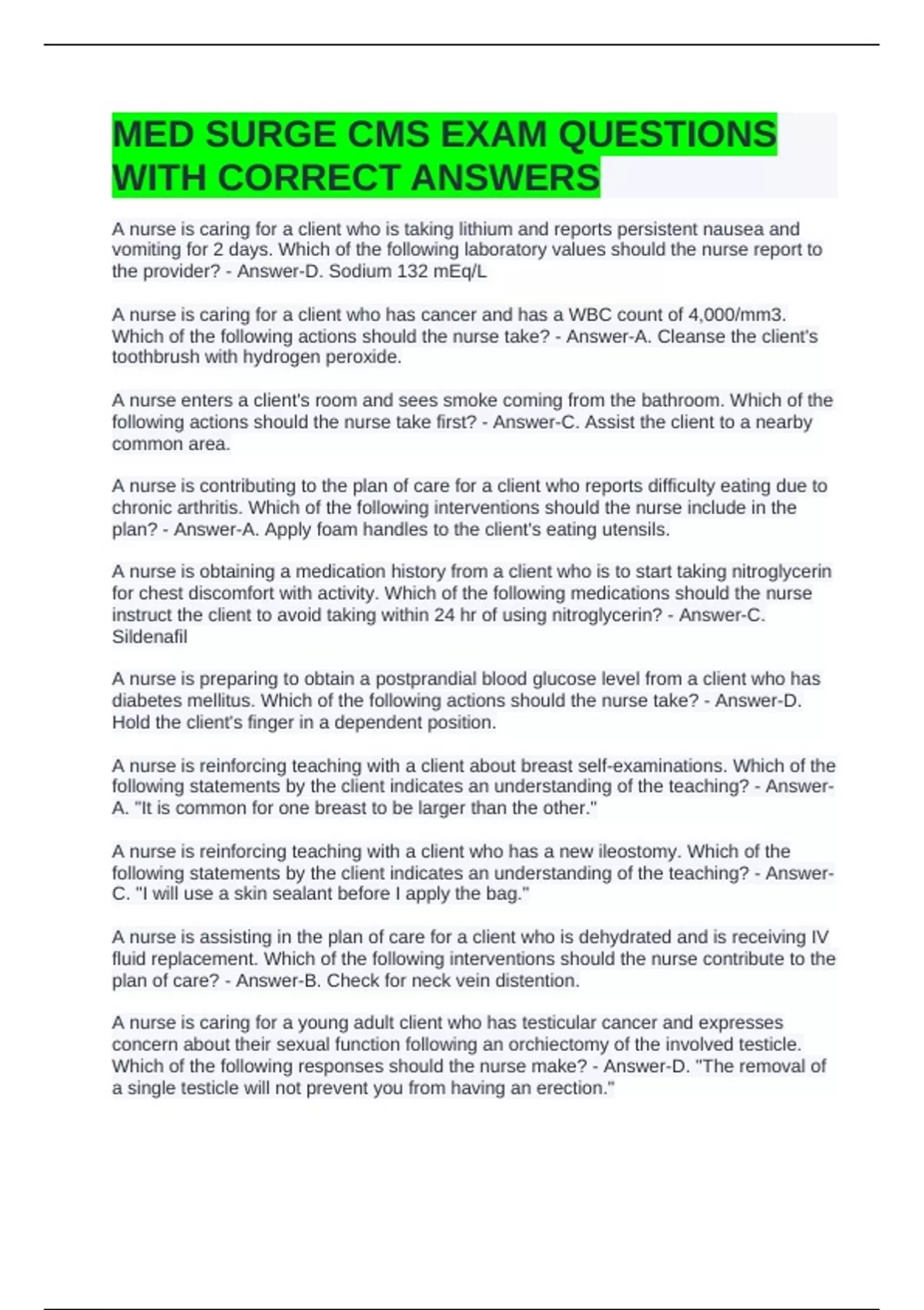 MED SURGE CMS EXAM QUESTIONS WITH CORRECT ANSWERS