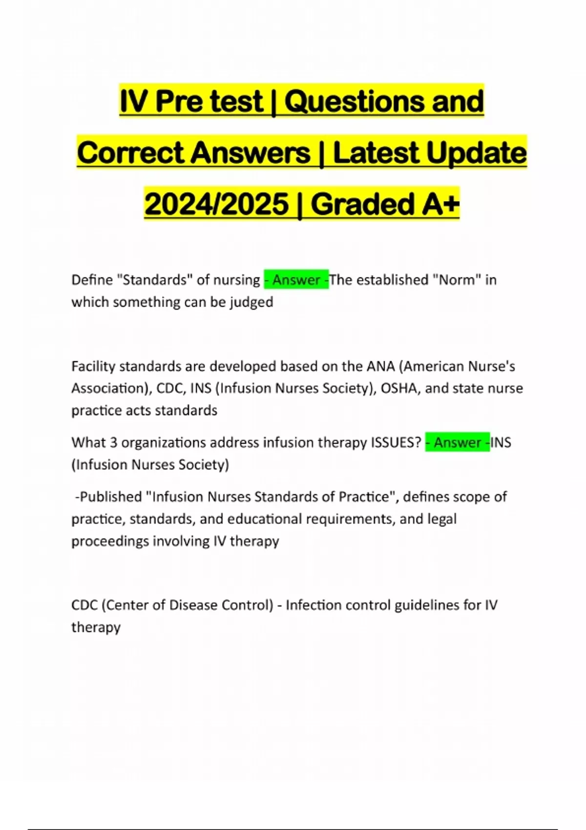 IV Pre test | Questions and Correct Answers | Latest Update 2024/2025 | Graded A+ Define "Standards" of nursing - Answer -The established "Norm" in which something can be judged Facility standards are developed based on the ANA (American Nurse's Association), CDC, INS (Infusion Nurses Society), OSHA, and state nurse practice acts standards What 3 organizations address infusion therapy ISSUES? - Answer -INS (Infusion Nurses Society) -Published "Infusion Nurses Standards of Practice", defines scope of practice, standards, and educational requirements, and legal proceedings involving IV therapy CDC (Center of Disease Control) - Infection control guidelines for IV therapyOSHA (Occupational Safety and Health Admin)- Developed Blood-borne Pathogen Standards and the Needle-stick Safety and Prevention Act According to the FL law, what is the difference between "under the direction" of a RN, or "under direct supervision" of a RN? - Answer - UNDER THE DIRECTION- means that the RN has DELEGATED the IV therapy functions to a qualified LPN. The RN does NOT have to be on the premisis UNDER DIRECT SUPERVISION- means the RN is ON the premisis and is physically available Define "The Nurse Practice Act" - Answer -Defines the practice of RNs, LPN;s and vocational nursed in eac