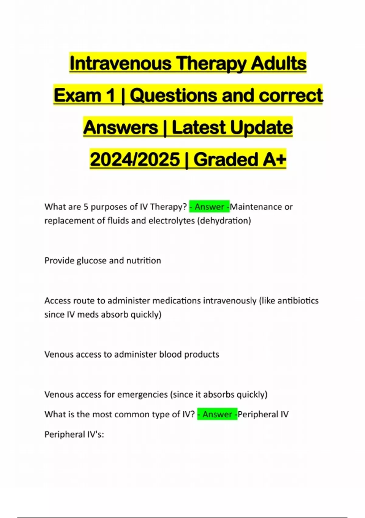 Intravenous Therapy Adults Exam 1 | Questions and correct Answers | Latest Update 2024/2025 | Graded A+ What are 5 purposes of IV Therapy? - Answer -Maintenance or replacement of fluids and electrolytes (dehydration) Provide glucose and nutrition Access route to administer medications intravenously (like antibiotics since IV meds absorb quickly) Venous access to administer blood products Venous access for emergencies (since it absorbs quickly) What is the most common type of IV? - Answer -Peripheral IV Peripheral IV's:-Long or short term use? -How often do these need to be changed? -What do we use for intermittent access? -What do we use to flush peripheral IV's? - Answer -Peripheral IV's: -Short term use -Change Q 96 Hours OR according to agency's pol