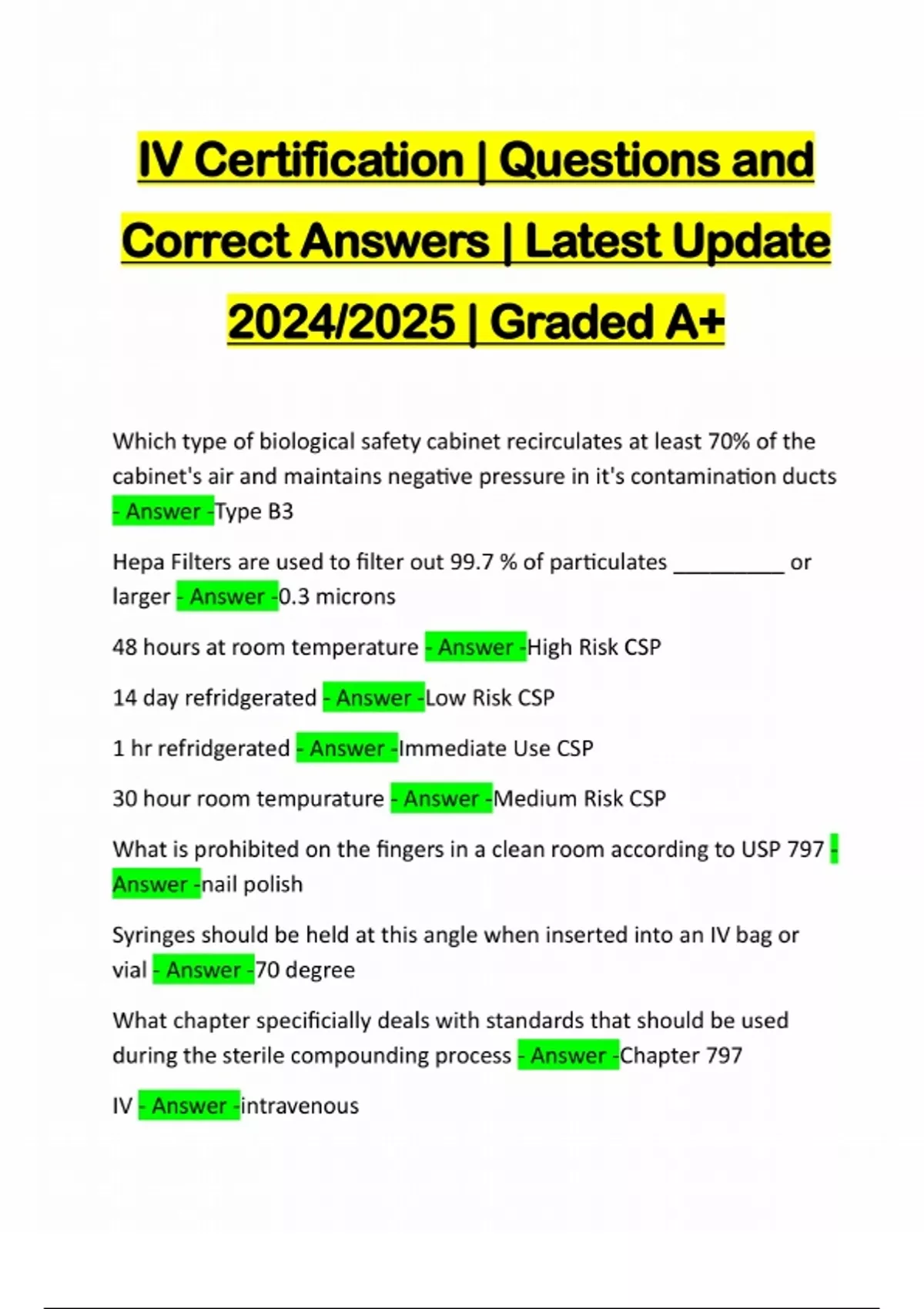 IV Certification | Questions and Correct Answers | Latest Update 2024/2025 | Graded A+ Which type of biological safety cabinet recirculates at least 70% of the cabinet's air and maintains negative pressure in it's contamination ducts - Answer -Type B3 Hepa Filters are used to filter out 99.7 % of particulates _________ or larger - Answer -0.3 microns 48 hours at room temperature - Answer -High Risk CSP 14 day refridgerated - Answer -Low Risk CSP 1 hr refridgerated - Answer -Immediate Use CSP 30 hour room tempurature - Answer -Medium Risk CSP What is prohibited on the fingers in a clean room according to USP 797 - Answer -nail polish Syringes should be held at this angle when inserted into an IV bag or vial - Answer -70 degree What chapter specificially deals with standards that should be used during the sterile compounding process - Answer -Chapter 797 IV - Answer -intravenousIM - Answer -intramuscular Subqutaneous - Answer -Sub Q or sub0q intra arterial - Answer -IA intrathecal - Answer -IT intraocular - Answer -IOL intraperitonel - Answer -IP