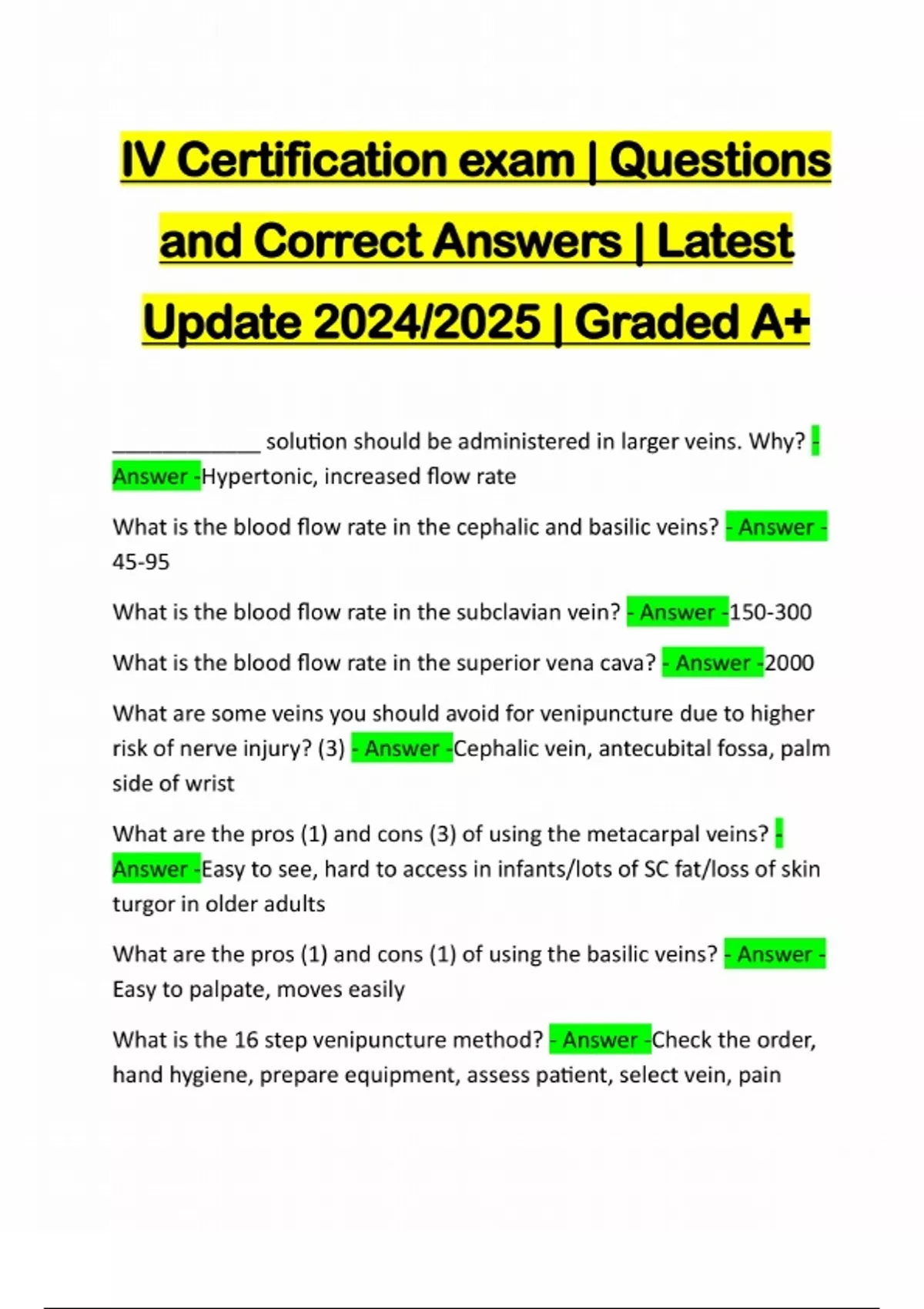 IV Certification exam | Questions and Correct Answers | Latest Update 2024/2025 | Graded A+ ____________ solution should be administered in larger veins. Why? - Answer -Hypertonic, increased flow rate What is the blood flow rate in the cephalic and basilic veins? - Answer - 45-95 What is the blood flow rate in the subclavian vein? - Answer -150-300 What is the blood flow rate in the superior vena cava? - Answer -2000 What are some veins you should avoid for venipuncture due to higher risk of nerve injury? (3) - Answer -Cephalic vein, antecubital fossa, palm side of wrist What are the pros (1) and cons (3) of using the metacarpal veins? - Answer -Easy to see, hard to access in infants/lots of SC fat/loss of skin turgor in older adults What are the pros (1) and cons (1) of using the basilic veins? - Answer - Easy to palpate, moves easily What is the 16 step venipuncture method? - Answer -Check the order, hand hygiene, prepare equipment, assess patient, select vein, painmanagement, catheter selection, gloving, site prep, vein entry, catheter stabilization and dressing, label, dispose equipment, patient education, rate calculations, documentation What should the order for and IV include? (8) - Answer -Date and time, infusate, route, dose, VTIB, rate, duratio