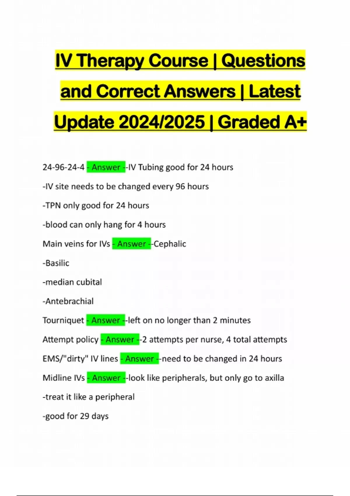 IV Therapy Course | Questions and Correct Answers | Latest Update 2024/2025 | Graded A+ 24-96-24-4 - Answer --IV Tubing good for 24 hours -IV site needs to be changed every 96 hours -TPN only good for 24 hours -blood can only hang for 4 hours Main veins for IVs - Answer --Cephalic -Basilic -median cubital -Antebrachial Tourniquet - Answer --left on no longer than 2 minutes Attempt policy - Answer --2 attempts per nurse, 4 total attempts EMS/"dirty" IV lines - Answer --need to be changed in 24 hours Midline IVs - Answer --look like peripherals, but only go to axilla -treat it like a peripheral -good for 29 daysPICC lines - Answer --used for therapy longer than 6 days -cant be inserted on side if mastectomy was done -dressing change q7days Extravasation - Answer --d