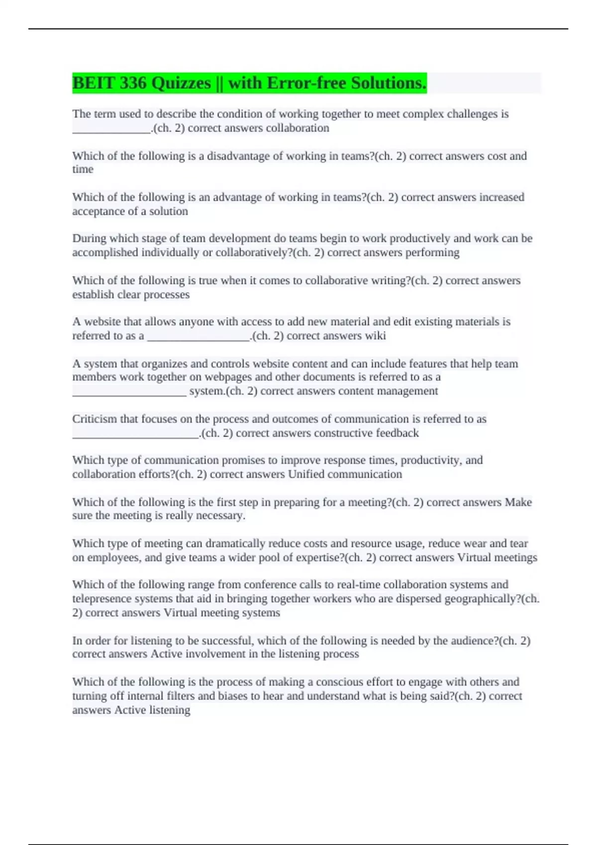 The term used to describe the condition of working together to meet complex challenges is _____________.(ch. 2) correct answers collaboration Which of the following is a disadvantage of working in teams?(ch. 2) correct answers cost and time Which of the following is an advantage of working in teams?(ch. 2) correct answers increased acceptance of a solution During which stage of team development do teams begin to work productively and work can be accomplished individually or collaboratively?(ch. 2) correct answers performing Which of the following is true when it comes to collaborative writing?(ch. 2) correct answers establish clear processes A website that allows anyone with access to add new material and edit existing materials is referred to as a _________________.(ch. 2) correct answers wiki A system that organizes and controls website content and can include features that help team members work together on webpages and other documents is referred to as a ___________________ system.(ch. 2) correct answers content management Criticism that focuses on the process and outcomes of communication is referred to as _____________________.(ch. 2) correct answers constructive feedback Which type of communication promises to improve response times, productivity, and collaboration efforts?(ch. 2) correct answers Unified communication Which of the following is the first step in preparing for a meeting?(ch. 2) correct answers Make sure the meeting is really necessary. Which type of meeting can dramatically reduce costs and resource usage, reduce wear and tear on employees, and give teams a wider pool of expertise?(ch. 2) correct answers Virtual meetings Which of the following range from conference calls to real-time collaboration systems and telepresence systems that aid in bringing together workers who are dispersed geographically?(ch. 2) correct answers Virtual meeting systems In order for listening to be successful, which of the following is needed by the audience?(ch. 2) correct answers Active involvement in the listening process Which of the following is the process of making a conscious effort to engage with others and turning off internal filters and biases to hear and understand what is being said?(ch. 2) correct answers Active listening