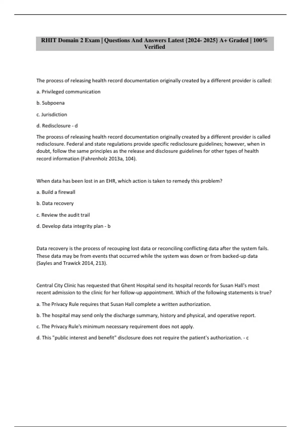RHIT Domain 2 Exam | Questions And Answers Latest {2024- 2025} A+ Graded | 100%