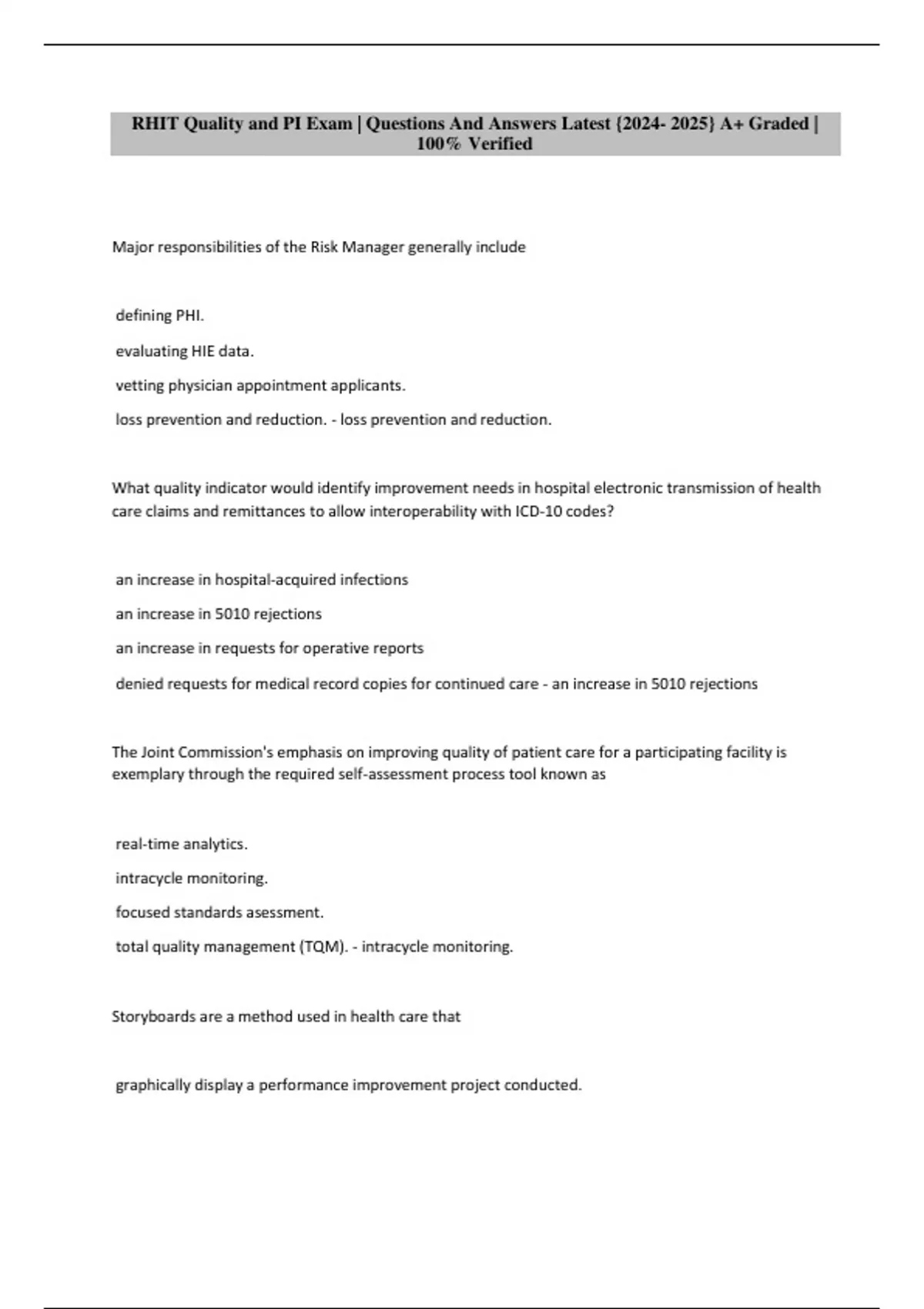 RHIT Quality and PI Exam | Questions And Answers Latest {2024- 2025} A+ Graded |