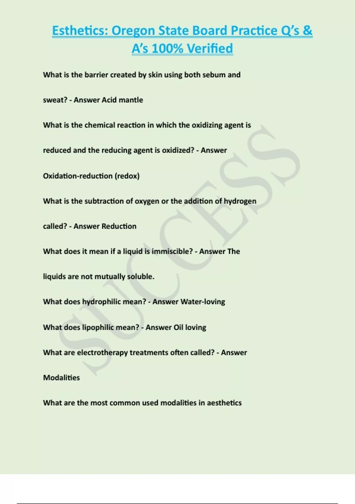 Esthetics: Oregon State Board Practice Q’s & A’s 100% Verified
