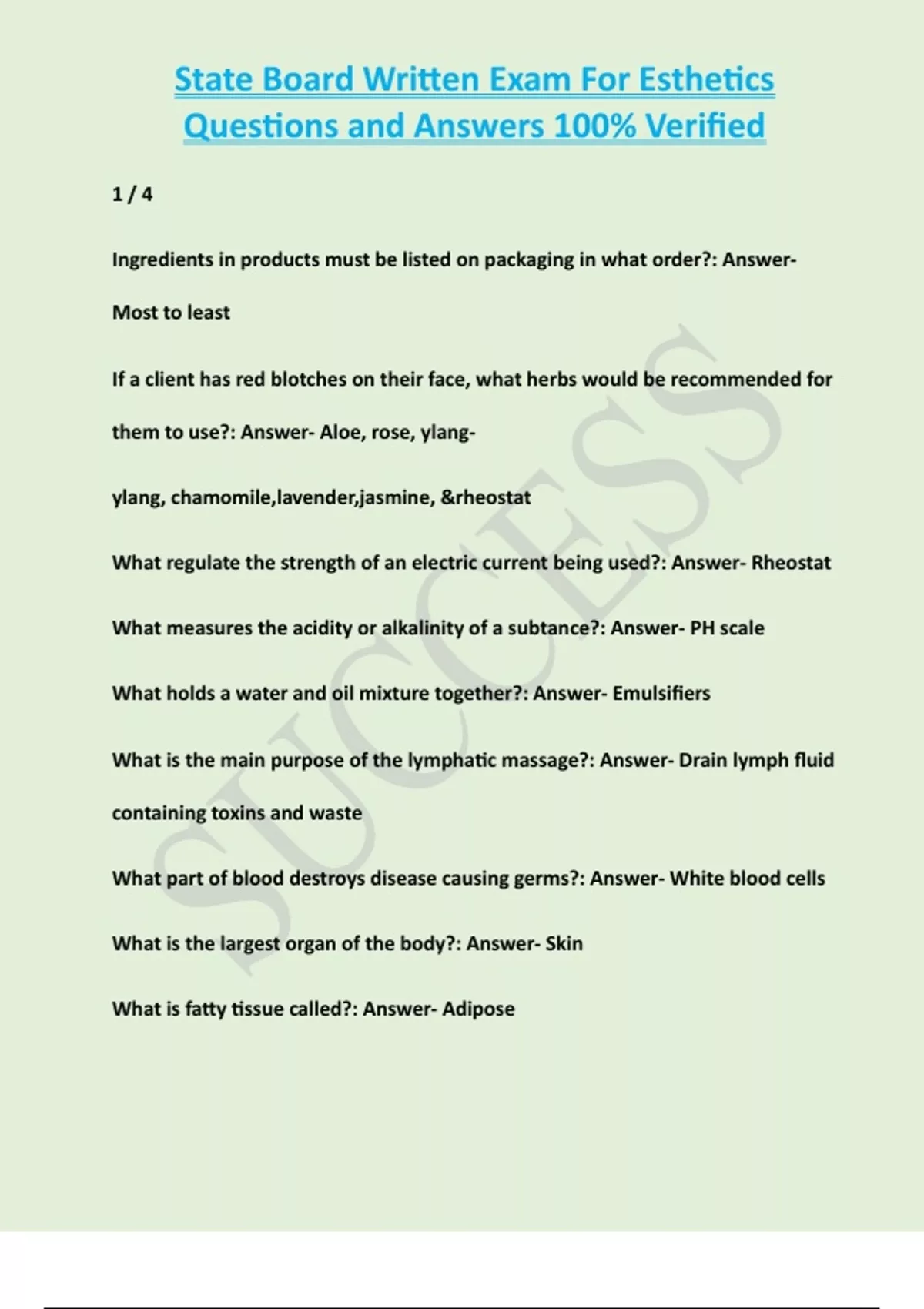 State Board Written Exam For Esthetics Questions and Answers 100% Verified 1 / 4 Ingredients in products must be listed on packaging in what order?: AnswerMost to least If a client has red blotches on their face, what herbs would be recommended for them to use?: Answer- Aloe, rose, ylangylang, chamomile,lavender,jasmine, &rheostat What regulate the strength of an electric current being used?: Answer- Rheostat What measures the acidity or alkalinity of a subtance?: Answer- PH scale What holds a water and oil mixture together?: Answer- Emulsifiers