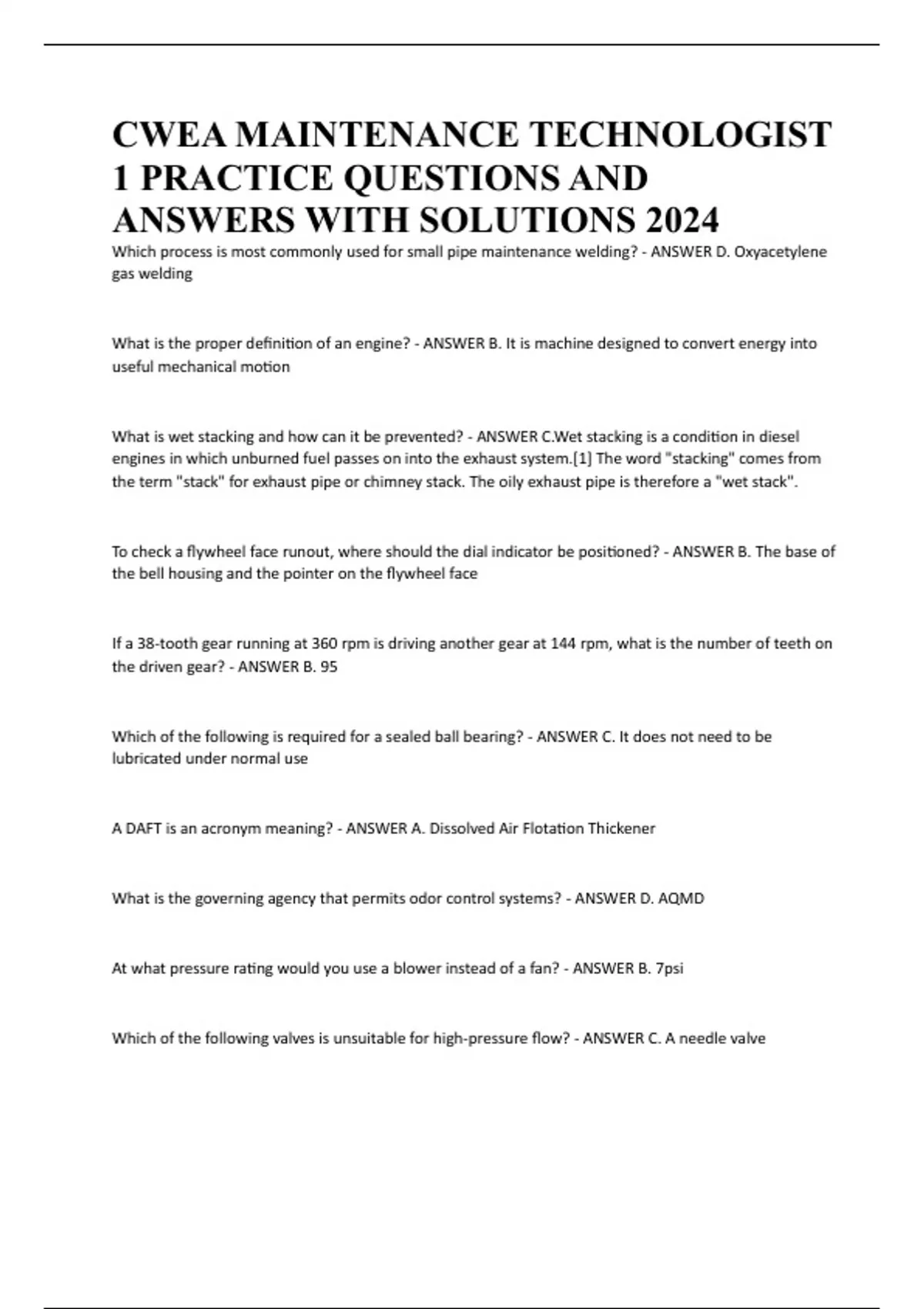 CWEA MAINTENANCE TECHNOLOGIST 1 PRACTICE QUESTIONS AND ANSWERS WITH SOLUTIONS 2024