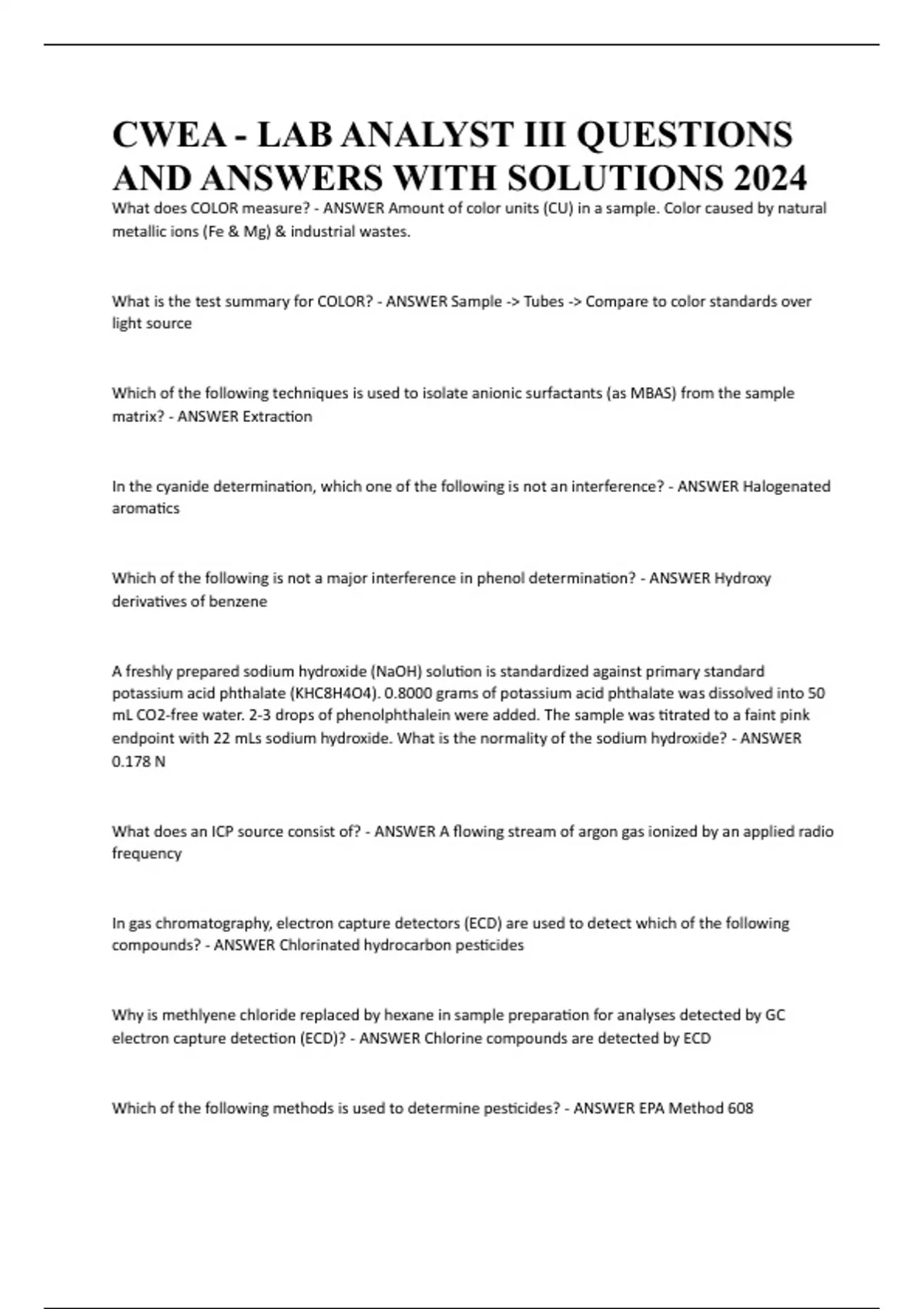 CWEA - LAB ANALYST III QUESTIONS AND ANSWERS WITH SOLUTIONS 2024