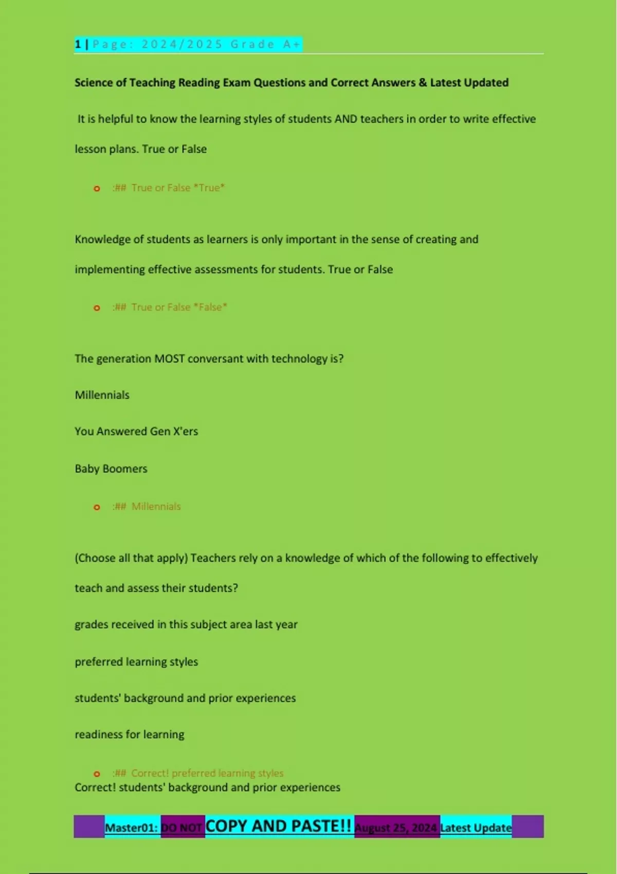 Science of Teaching Reading Exam Questions and Correct Answers & Latest Updated