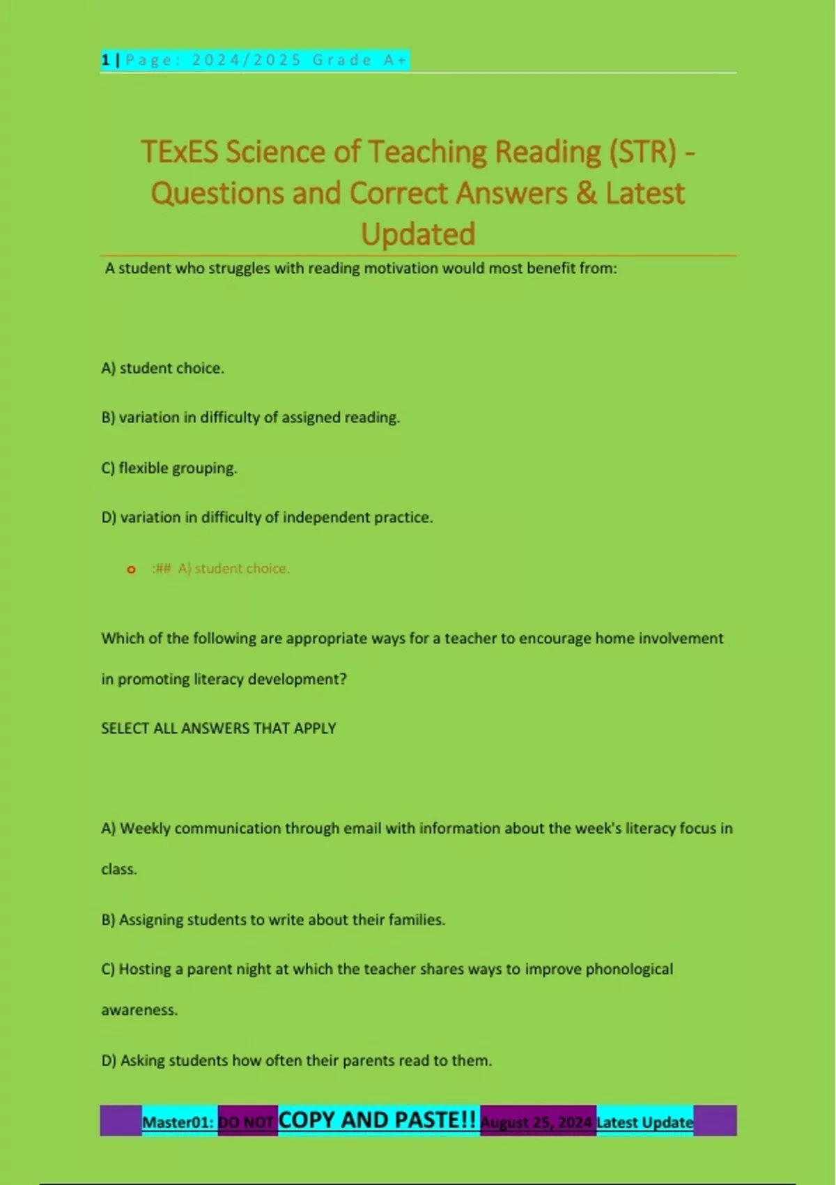 A student who struggles with reading motivation would most benefit from: A) student choice. B) variation in difficulty of assigned reading. C) flexible grouping. D) variation in difficulty of independent practice. o :## A) student choice. Which of the following are appropriate ways for a teacher to encourage home involvement in promoting literacy development? SELECT ALL ANSWERS THAT APPLY A) Weekly communication through email with information about the week's literacy focus in class. B) Assigning students to write about their families. C) Hosting a parent night at which the teacher shares ways to improve phonological awareness. D) Asking students how often their parents read to them. 2 | P a g e : 2 0 2 4 / 2 0 2 5 G r a d e A + Master01: DO NOT COPY AND PASTE!! August 25, 2024 Latest Update o :## A) Weekly communication through email with information about the week's literacy focus in class. C) Hosting a parent night at which the teacher shares ways to improve phonological awareness. A 3rd grade teacher wants to provide some enrichment activities for a small group of students who have already mastered identifying the plot, main idea, and main characters in short stories. Which skill below would be the best to study next while still staying in line with TEKS identified appropriate skills for 3rd grade students? A) Compare and contrast the characteristics of two stories. B) Analyze nonfiction texts for the use chronological text structure. C) Identify plot points as part of the rising or falling action. D) Identify and interpret literary devices such as metaphors or personification. o :## A) Compare and contrast the characteristics of two stories. A 1st grade teacher is setting up her classroom library to support student engagement and choice in students' reading habits. She has established the following rules and expectations: *Students will only check out one book at a time, returning it before being allowed to check out a new book. *Students will not be limited to books at their independent reading level. *There will be opportunities to read these individually chosen books in class and to take them home overnight. 3 | P a g e : 2 0 2 4 / 2 0 2 5 G r a d e A + Master01: DO NOT COPY AND PASTE!! August 25, 2024 Latest Update *Students will have flexible and frequent opportunities throughout the week to explore the books in the classroom library. With a focus on fostering a love of reading and promoting the value of literacy, which of these guidelines should the teacher reconsider? A) Students will only check one book at a time, returning it before being allowed to check out a new book. B) Students will not be limited to books at their independent reading level. C) T o :## A) Students will only check one book at a time, returning it before being allowed to check out a new book. Which of the following are appropriate ways for a teacher to help students develop literacy? SELECT ALL ANSWERS THAT APPL