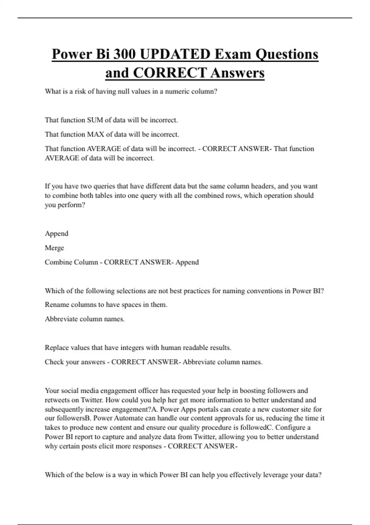 Power Bi 300 UPDATED Exam Questions and CORRECT Answers What is a risk of having null values in a numeric column? That function SUM of data will be incorrect. That function MAX of data will be incorrect. That function AVERAGE of data will be incorrect. - CORRECT ANSWER- That function AVERAGE of data will be incorrect.