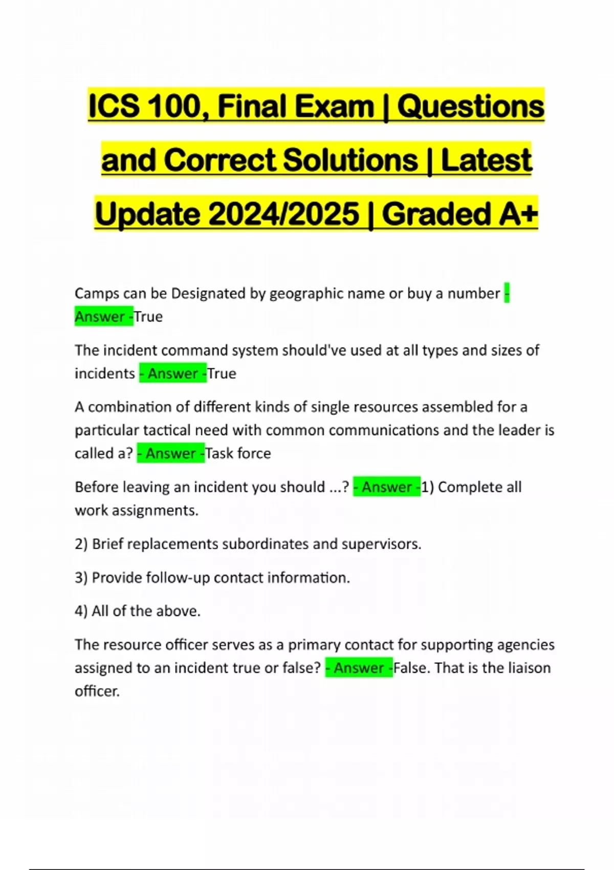 ICS 100, Final Exam | Questions and Correct Solutions | Latest Update 2024/2025 | Graded A+ Camps can be Designated by geographic name or buy a number - Answer -True The incident command system should've used at all types and sizes of incidents - Answer -True A combination of different kinds of single resources assembled for a particular tactical need with common communications and the leader is called a? - Answer -Task force Before leaving an incident you should ...? - Answer -1) Complete all work assignments. 2) Brief replacements subordinates and supervisors. 3) Provide follow-up contact information. 4) All of the above. The resource officer serves as a primary contact for supporting agencies assigned to an incident true or false? - Answer -False. That is the liaison officer.Incident command post shou