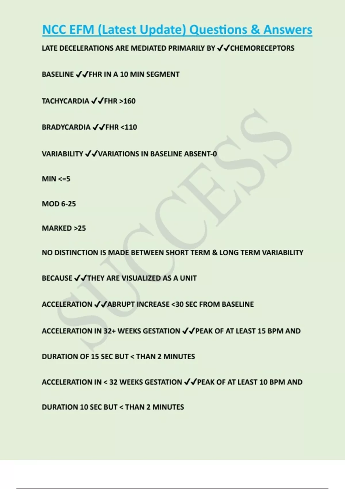 NCC EFM (Latest Update) Questions & Answers LATE DECELERATIONS ARE MEDIATED PRIMARILY BY CHEMORECEPTORS BASELINE FHR IN A 10 MIN SEGMENT TACHYCARDIA FHR >160 BRADYCARDIA FHR <110 VARIABILITY VARIATIONS IN BASELINE ABSENT-0 MIN <=5 MOD 6-25 MARKED >25