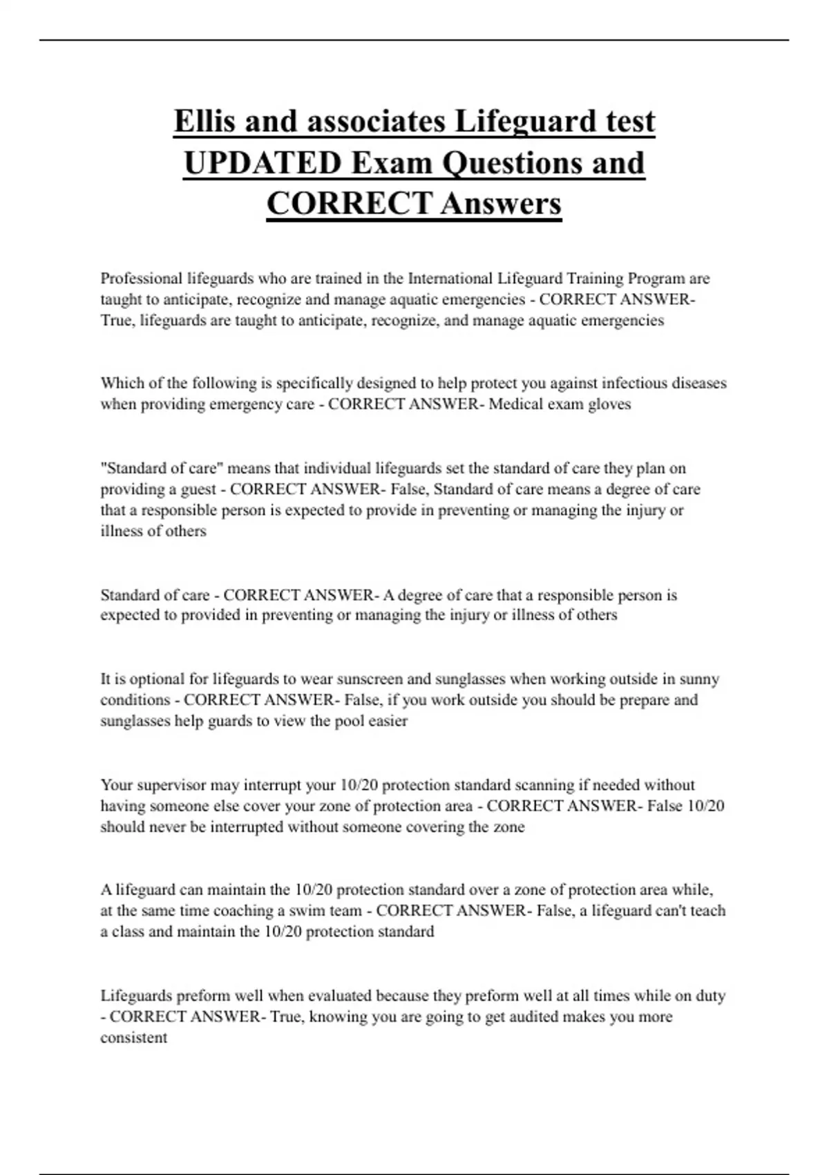 Ellis and associates Lifeguard test UPDATED Exam Questions and CORRECT Answers Professional lifeguards who are trained in the International Lifeguard Training Program are taught to anticipate, recognize and manage aquatic emergencies - CORRECT ANSWERTrue, lifeguards are taught to anticipate, recognize, and manage aquatic emergencies Which of the following is specifically designed to help protect you against infectious diseases when providing emergency care - CORRECT ANSWER- Medical exam gloves