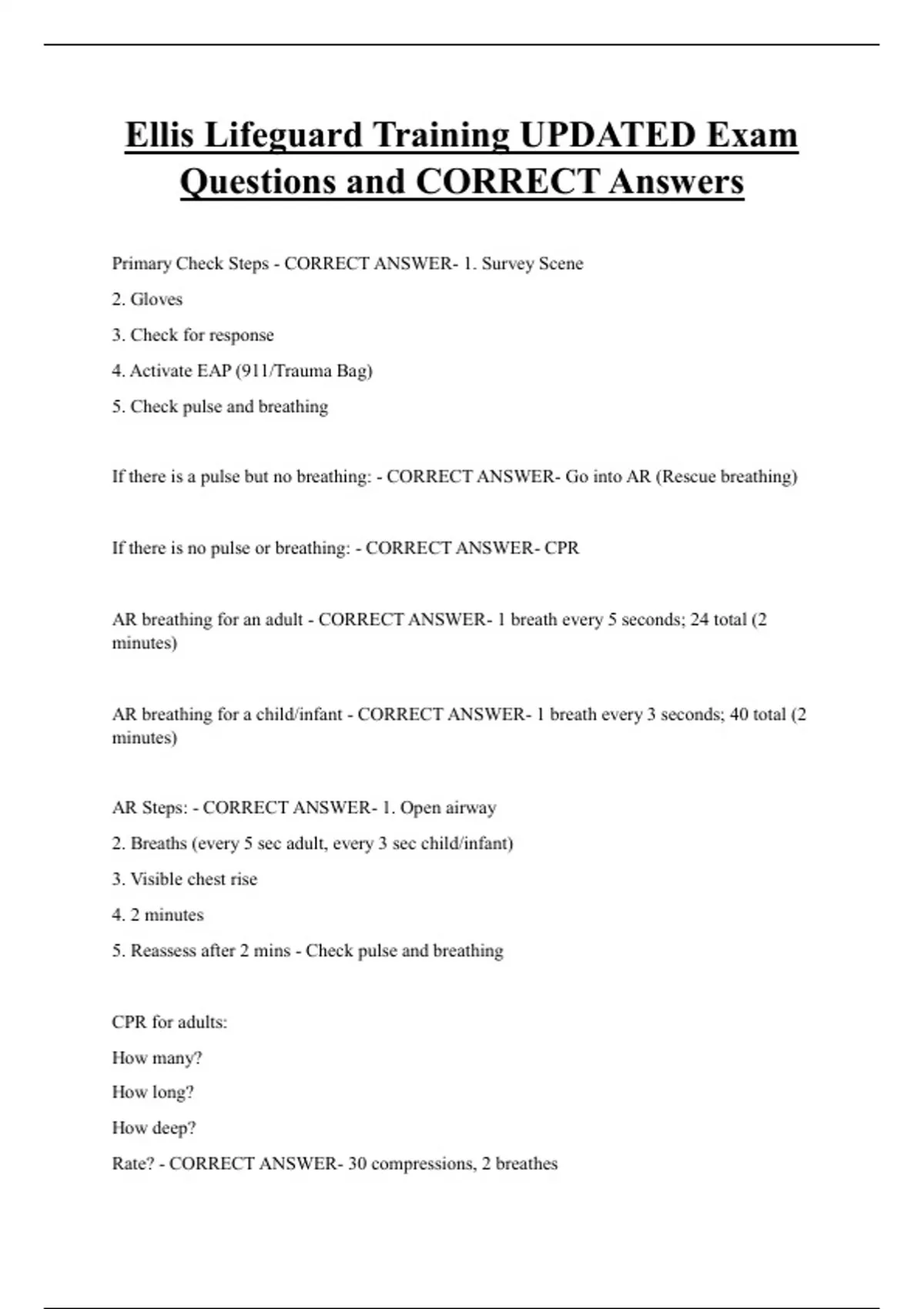 Ellis Lifeguard Training UPDATED Exam Questions and CORRECT Answers Primary Check Steps - CORRECT ANSWER- 1. Survey Scene 2. Gloves 3. Check for response 4. Activate EAP (911/Trauma Bag) 5. Check pulse and breathing If there is a pulse but no breathing: - CORRECT ANSWER- Go into AR (Rescue breathing) If there is no pulse or breathing: - CORRECT ANSWER- CPR