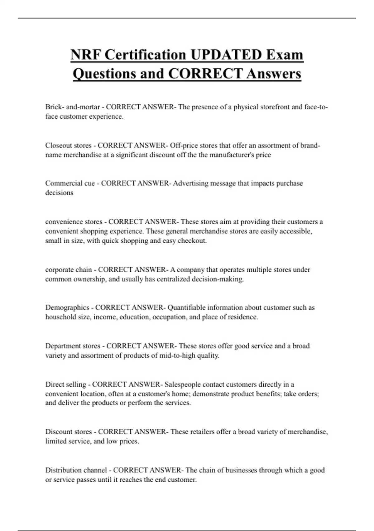 NRF Certification UPDATED Exam Questions and CORRECT Answers Brick- and-mortar - CORRECT ANSWER- The presence of a physical storefront and face-toface customer experience. Closeout stores - CORRECT ANSWER- Off-price stores that offer an assortment of brandname merchandise at a significant discount off the the manufacturer's price