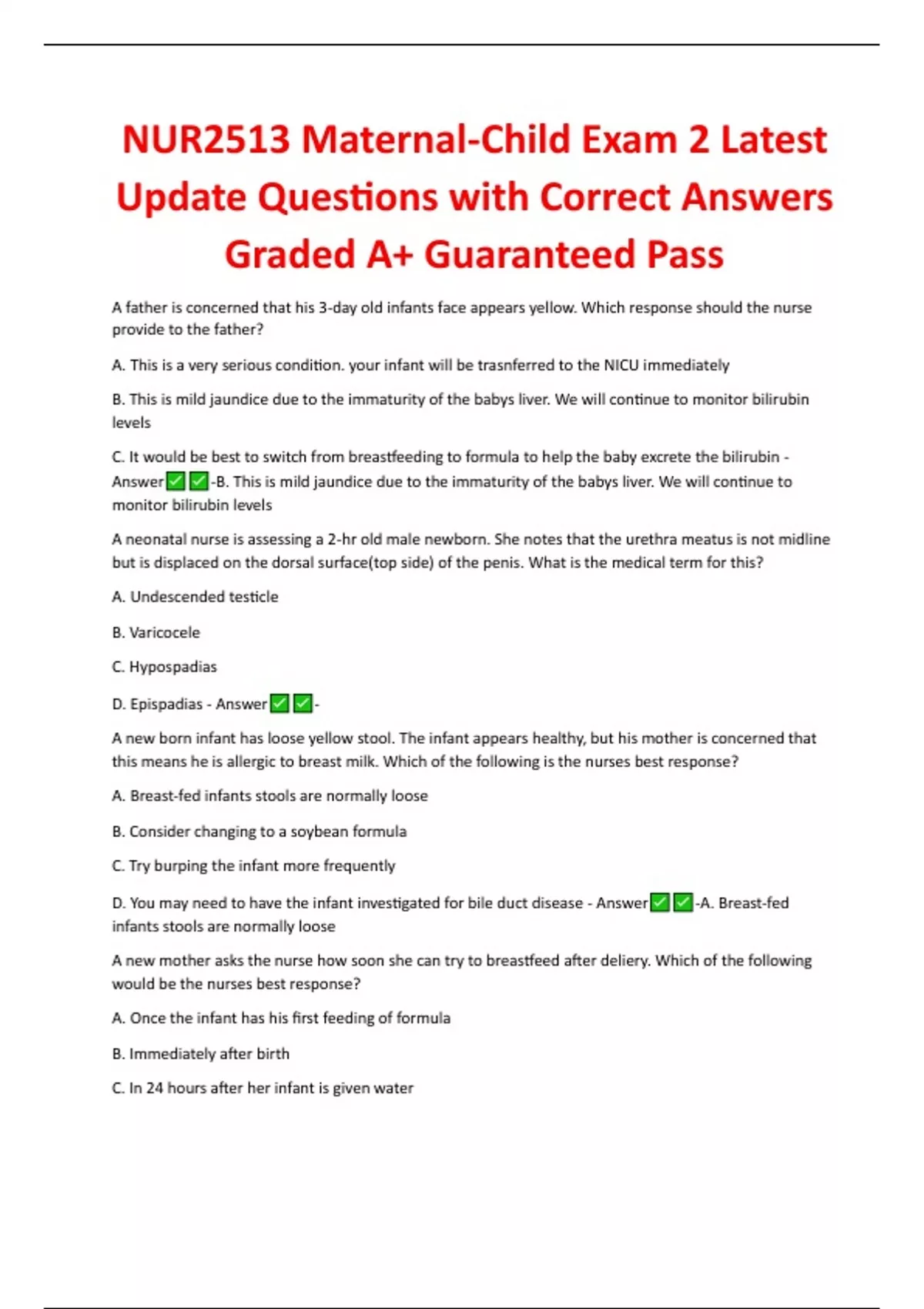 NUR2513 Maternal-Child Exam 2 Latest Update Questions with Correct Answers Graded A+ Guaranteed Pass A father is concerned that his 3-day old infants face appears yellow. Which response should the nurse provide to the father? A. This is a very serious condition. your infant will be trasnferred to the NICU immediately B. This is mild jaundice due to the immaturity of the babys liver. We will continue to monitor bilirubin levels C. It would be best to switch from breastfeeding to formula to help the baby excrete the bilirubin - Answer -B. This is mild jaundice due to the immaturity of the babys liver. We will continue to monitor bilirubin levels A neonatal nurse is assessing a 2-hr old male newborn. She notes that the urethra meatus is not midline but is displaced on the dorsal surface(top side) of the penis. What is the medical term for this? A. Undescended testicle B. Varicocele C. Hypospadias D. Epispadias - Answer - A new born infant has loose yellow stool. The infant appears healthy, but his mother is concerned that this means he is allergic to breast milk. Which of the following is the nurses best response? A. Breast-fed infants stools are normally loose B. Consider changing to a soybean formula C. Try burping the infant more frequently D. You may need to have the infant investigated for bile duct disease - Answer -A. Breast-fed infants stools are normally loose