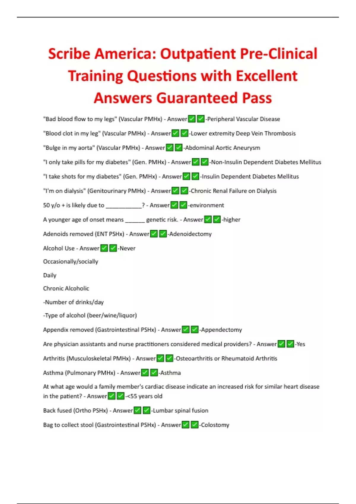 Scribe America: Outpatient Pre-Clinical Training Questions with Excellent Answers Guaranteed Pass "Bad blood flow to my legs" (Vascular PMHx) - Answer -Peripheral Vascular Disease "Blood clot in my leg" (Vascular PMHx) - Answer -Lower extremity Deep Vein Thrombosis "Bulge in my aorta" (Vascular PMHx) - Answer -Abdominal Aortic Aneurysm "I only take pills for my diabetes" (Gen. PMHx) - Answer -Non-Insulin Dependent Diabetes Mellitus "I take shots for my diabetes" (Gen. PMHx) - Answer -Insulin Dependent Diabetes Mellitus "I'm on dialysis" (Genitourinary PMHx) - Answer -Chronic Renal Failure on Dialysis 50 y/o + is likely due to ___________? - Answer -environment A younger age of onset means ______ genetic risk. - Answer -higher Adenoids removed (ENT PSHx) - Answer -Adenoidectomy Alcohol Use - Answer -Never Occasionally/socially Daily Chronic Alcoholic -Number of drinks/day -Type of alcohol (beer/wine/liquor) Appendix removed (Gastrointestinal PSHx) - Answer -Appendectomy