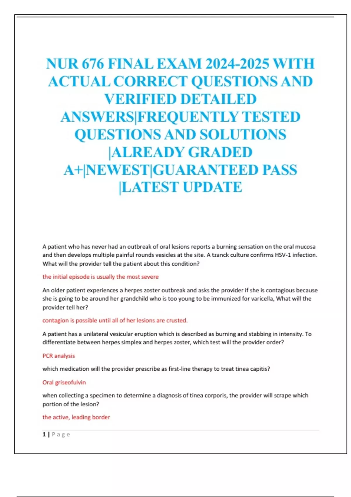 NUR 676 FINAL EXAM WITH ACTUAL CORRECT QUESTIONS AND VERIFIED DETAILED ANSWERS|FREQUENTLY TESTED QUESTIONS AND SOLUTIONS |ALREADY GRADED A+|NEWEST|GUARANTEED PASS |LATEST UPDATE