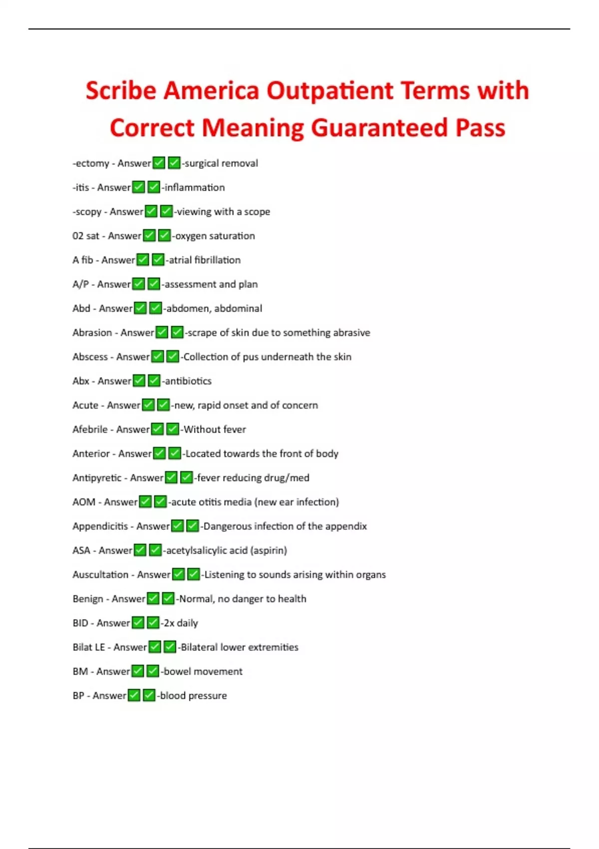 Scribe America Outpatient Terms with Correct Meaning Guaranteed Pass -ectomy - Answer -surgical removal -itis - Answer -inflammation -scopy - Answer -viewing with a scope 02 sat - Answer -oxygen saturation A fib - Answer -atrial fibrillation A/P - Answer -assessment and plan Abd - Answer -abdomen, abdominal Abrasion - Answer -scrape of skin due to something abrasive Abscess - Answer -Collection of pus underneath the skin Abx - Answer -antibiotics Acute - Answer -new, rapid onset and of concern Afebrile - Answer -Without fever Anterior - Answer -Located towards the front of body Antipyretic - Answer -fever reducing drug/med AOM - Answer -acute otitis media (new ear infection) Appendicitis - Answer -Dangerous infection of the appendix